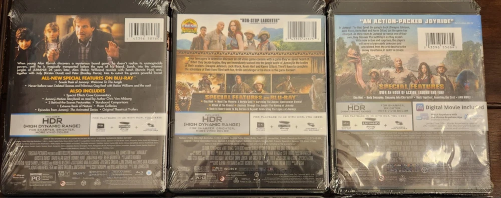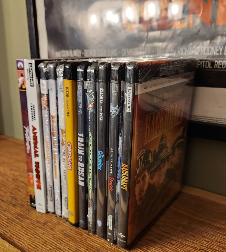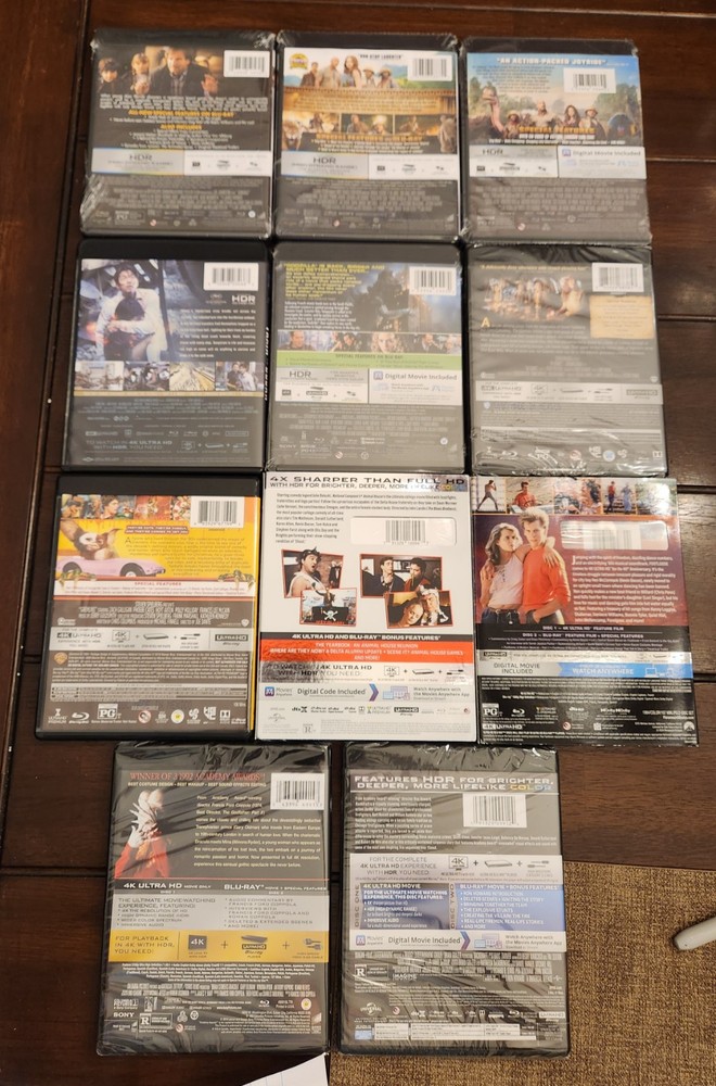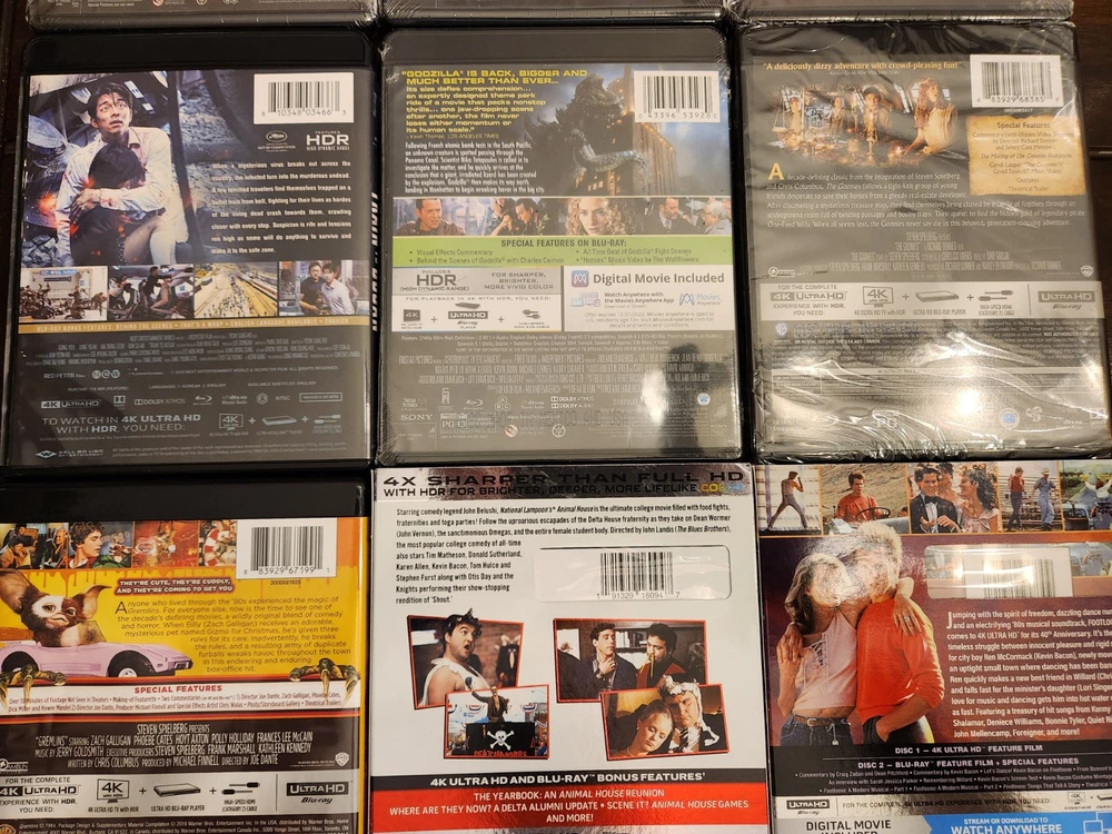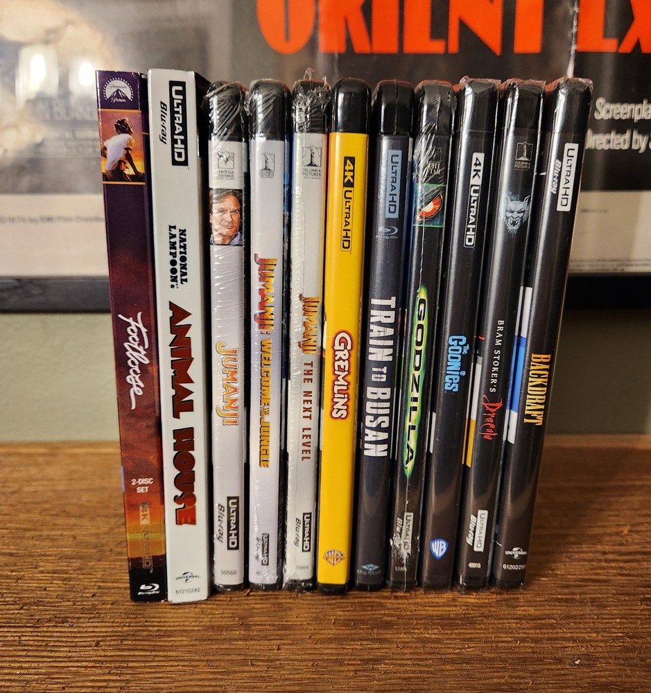 11 Assorted 4K Ultra HD Blu-Rays all Sealed New/Open Box New read description Includes: 1) Backdraft 2) Bram Stokers Dracula 3) Gremlins 4) The Goonies 5) Train To Busan 6) Godzilla 1998 7) Footloose 8) Animal House 9) Jumanji (1995) 10) Jumanji: Welcome to the Jungle 11) Jumanji: The Next Level All new Sealed or Open box new exactly as pictured see pictures before buying No Returns