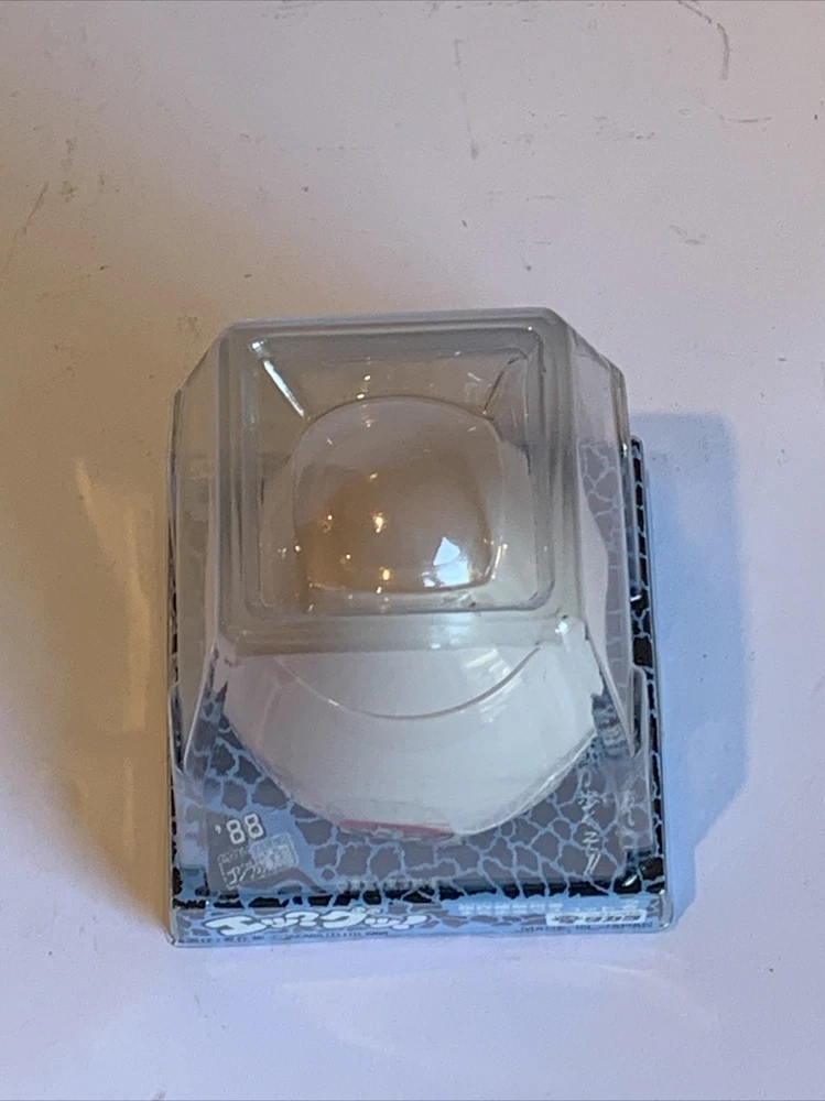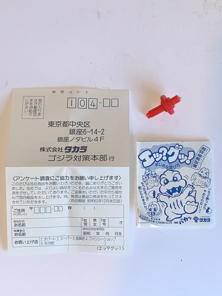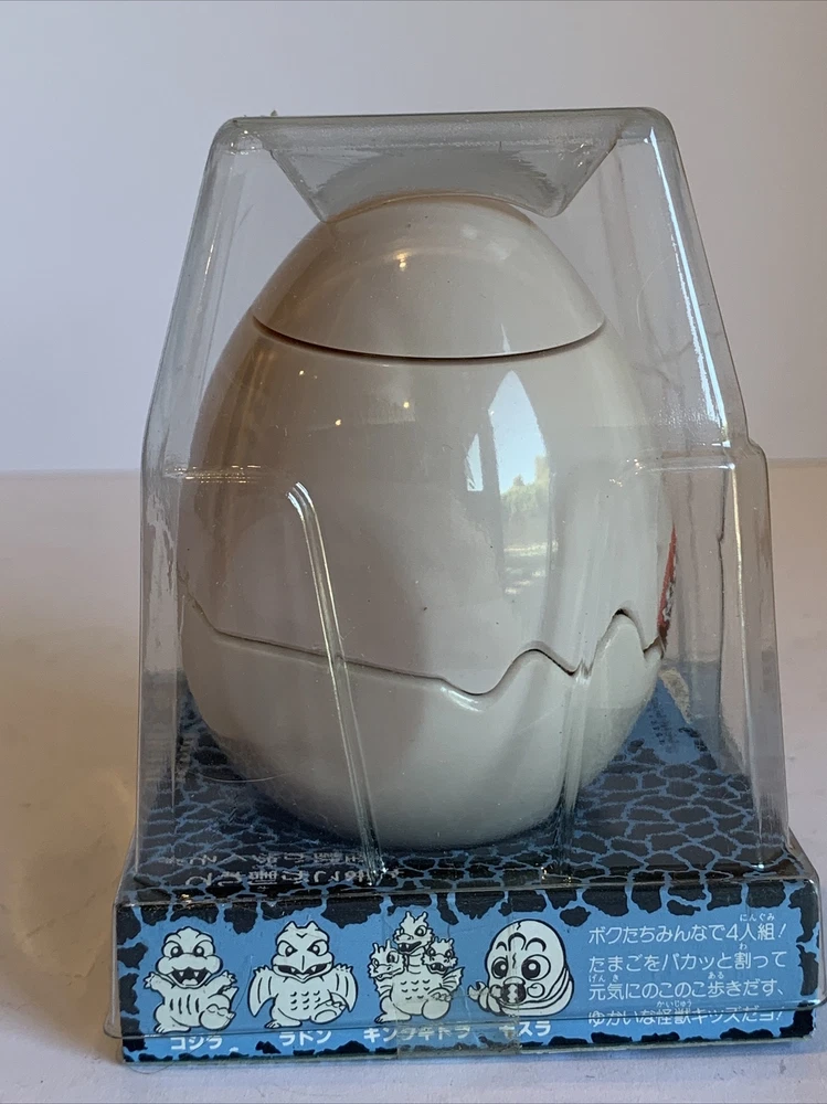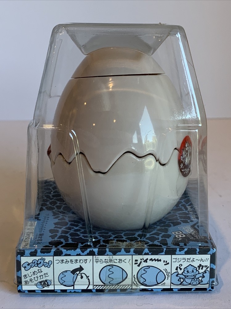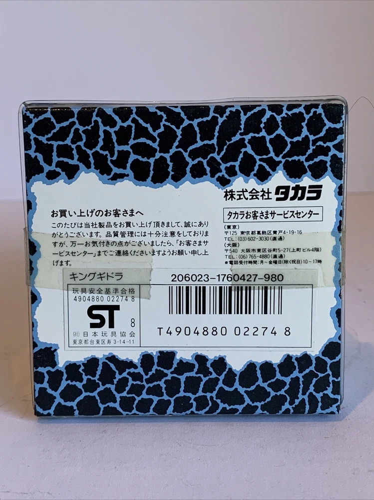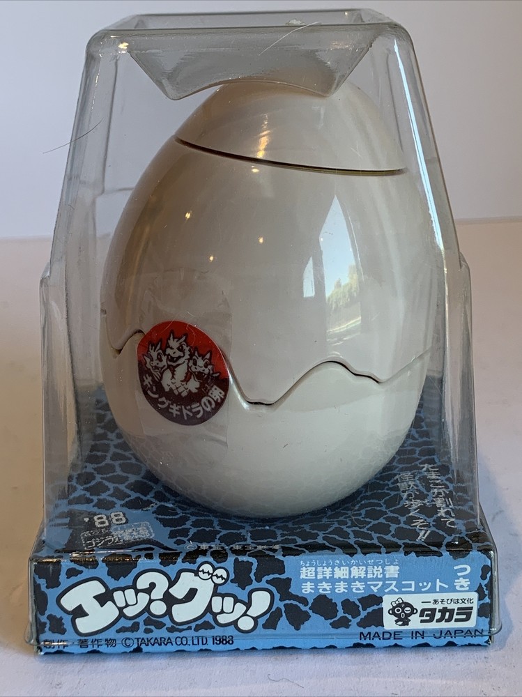 This windup toy is a must-have for any Godzilla fan! Produced by legendary Japanese toymaker Takara - before the merge with Tomy - this is a unique take on the Godzilla line is a hatchling Three-headed Ghidorah monster. Made in 1988, it is a rare find and comes in its original packaging. The toy features a wind-up mechanism that makes the monster hatch open its egg and move and shake its wings, and it stands at a height of approximately 5 inches. The toy is recommended for ages 17 and up and it is in working condition. Don't miss your chance to add this unique piece to your collection!