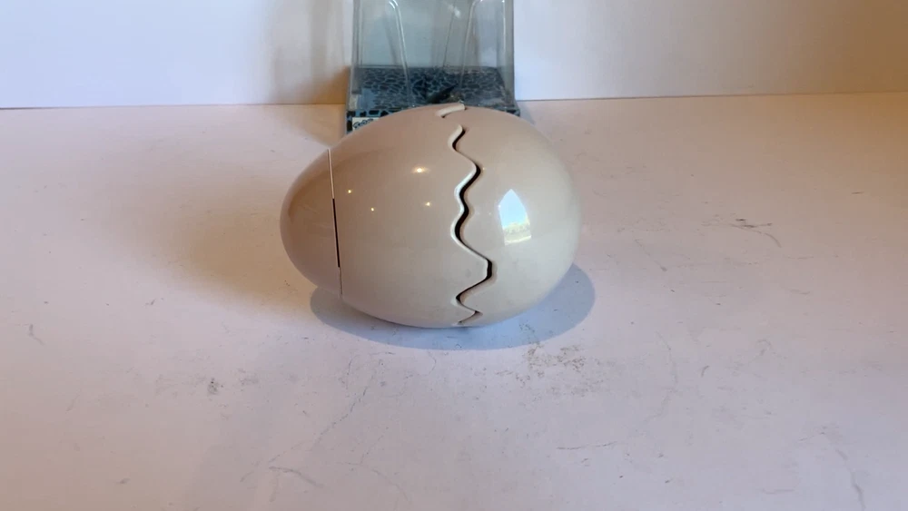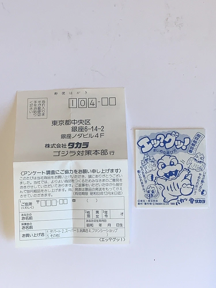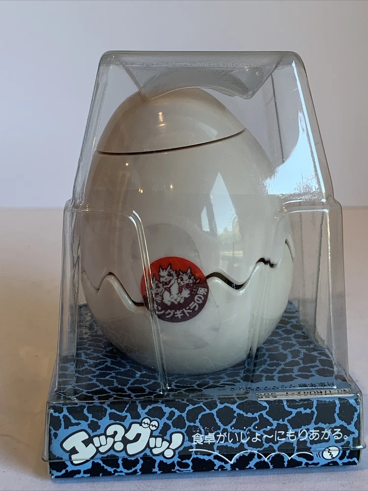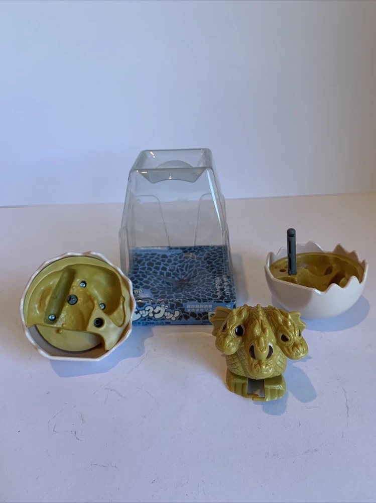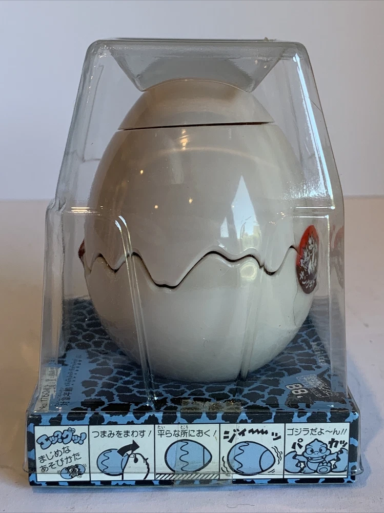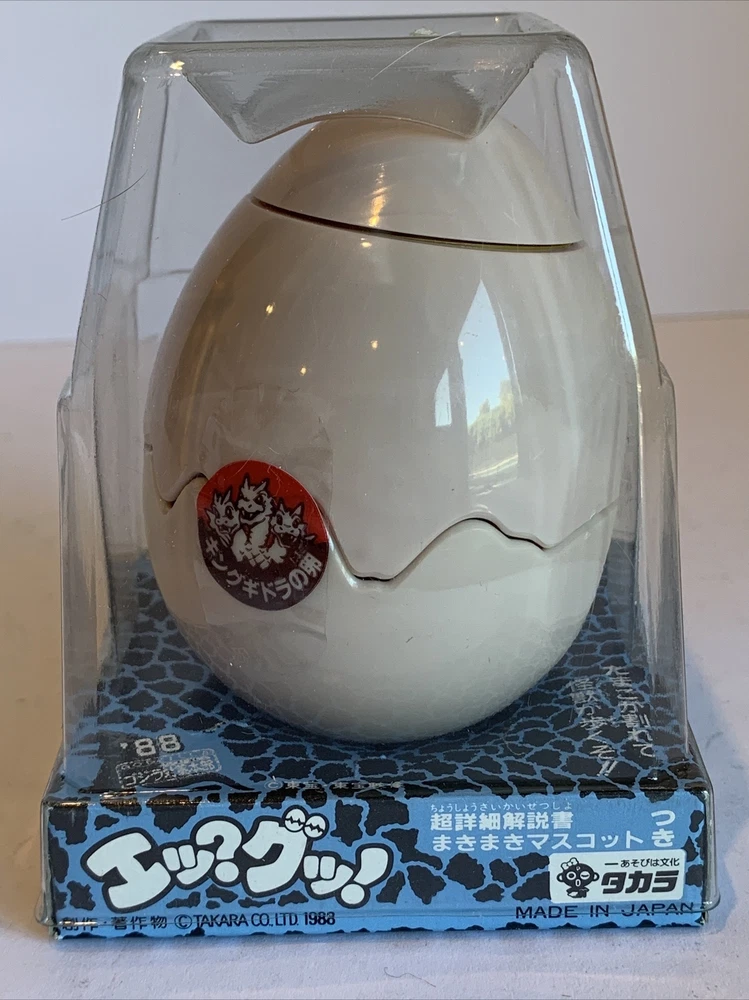 This windup toy is a must-have for any Godzilla fan! Produced by legendary Japanese toymaker Takara - before the merge with Tomy - this is a unique take on the Godzilla line is a hatchling Baby Ghidorah monster. Made in 1988, it is a rare find and comes in its original packaging. The toy features a wind-up mechanism that makes the monster hatch open its egg and move and shake its wings, and it stands at a height of approximately 5 inches. Don't miss your chance to add this unique piece to your collection!