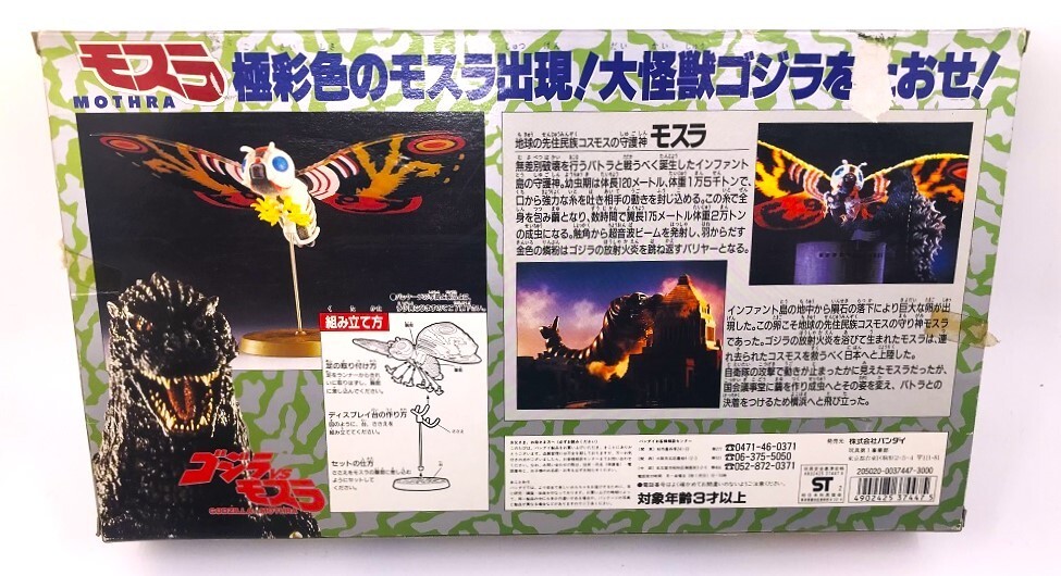 HOT FLASH! 1992 MOTHRA AND ALL GODZILLA FANS CHECK THIS OUT! THIS IS THE 1997 LIMITED EDITION DELUXE SPECIAL EDITION WITH STAND - 11 INCH WINGSPAN MOTHRA FROM BANDAI'S BRILLIANT DX MONSTER LINE AND IT'S A BEAUTY! AWESOMELY SCULPTED AND BEAUTIFULLY COLORED!!!!!!!!! SO DON'T MISS IT! THESE WILL NEVER BE MADE AGAIN!!! AND THIS IS YOUR CHANCE TO GET ONE MINT IN BOX!!!!! (PLEASE NOTE: THE CELLO WINDOW HAS 2 TINY STRESS MARKS - THEY ARE NOT!!! TEARS, YOU CAN SEE HOW MINUTE THEY ARE IN THE CLOSE-UP PHOTOS!) AND, AT A GREAT PRICE. YIPPEEE! (I HAVE MANY VINYLS FROM THE NEW BANDAI MOVIE MONSTER SERIES RELEASE: BIOLLANTE, BURNING GODZILLA, GODZILLA EARTH, MECHAGODZILLA WITH HEAVY ARMOR SOS, MECHA KING GHIDORAH, AND!!! THE ADULT BATTRA GIANT DELUXE EDITION FROM THE TOHO MOVIE!!! , AS WELL THAT IS AWESOME, UP ON EBAY TOO - LOOK FOR THEM - if you purchase others you can combine them for shipping and SAVE $ !!!!!). OFFERED HERE AT A REALLY LOW PRICE! BUYER PAYS SHIPPING AND INSURANCE & WITH PAYPAL (or email me for alternative payment methods - BEFORE BUYING! BUYER MUST SEND PAYMENT WITHIN 2 DAYS. THANKS FOR LOOKING! THIS IS MY LAST ONE!!!
