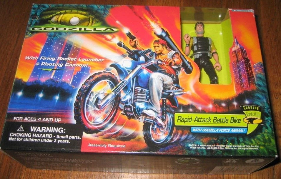 *** GODZILLA *** TOO BAD TRENDMASTERS IS NO LONGER IN BUSINESS - THEY MADE SOME OF THE BEST AND MOST LIMITED MOVIE LINES " THIS IS FOR THE RAPID-ATTACK BATTLE BIKE w / FIGURE " New ~ SEALED ~ VERY SHARP BOX Picture is ACTUAL item READ TERMS of sale and item condition below YES we ship internationally (request quote - MUST be insured when purchased as an EBAY auction or paid paypal) shipping/handling/insurance is for lower 48 states possible ADDITIONAL POSTAGE for this item if: $0.80 extra for RURAL addresses & PO boxes (incl APO /FPO) & PR $1.80 extra for AK,HI and $1.80 extra for GU TERMS OF SALE : PAYMENT within 3 says unless granted otherwise 1-4 BUSINESS DAYS shipping (excluding SATURDAYS) is general guideline TERMS OF CONDITION : VERY IMPORTANT - PLEASE READ THE FOLLOWING Most of our items are BRAND NEW, NEVER PLAYED WITH and sold MISB/MISP/NRFP/MOC/MIB (mint in sealed box/package, never removed from package, MINT on CARD or MINT in BOX). HOWEVER the TAPE and sometimes even the GLUE on AGED yet "BRAND NEW" SEALED COLLECTABLES can FATIGUE as it ages and come loose at any time, and will try to state such when/if noticed at listing. OUR GOAL IS ACCURACY AND HONESTY in all our descriptions and transactions, but unintended mistakes can occur. We take responsibility if it notably affects the integrity of the listed item and the picture or descripton could not clarify. Most items are sold as SEALED COLLECTABLES. Once a package is opened after purchase, it is no longer a SEALED collectable and not accepted for return. ** additionally, DUE TO THE NATURE OF COLLECTIBLES, ESPECIALLY SEALED COLLECTABLES , we are not responsible for the INTERNAL contents/condition of this or any other item in our auctions that are either in SEALED packages or BRAND NEW, UNLESS otherwise stated in the auction description As with ALL mass manufactured items, WE CAN NEVER GUARANTEE WORKING ELECTRONICS (unless stated otherwise), BATTERY condition or leakage, complete or unbroken accessories, un-flawed plastic, paint, decal application, box art, variations, etc., or any other factory related issues. KNOW THIS before bidding. MAKE NO ASSUMPTIONS if something is unclear. A picture may not show all the item and SIZE details you desire (sizes are generally very close estimations), so be sure you ask all your questions BEFORE BIDDING. If we are aware of the item being an actual variation we will most likely be selling it as such and will note it in the description.