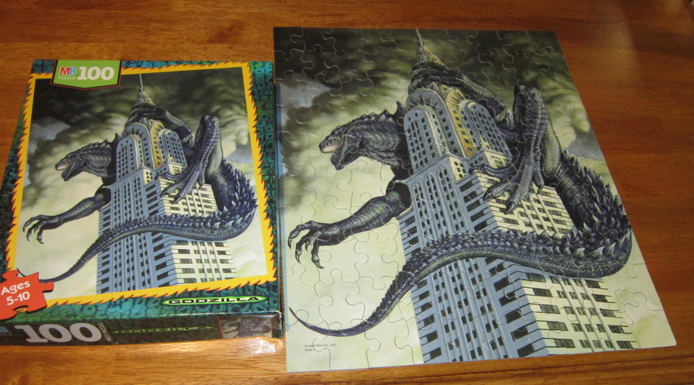 This 100 piece Godzilla puzzle is complete and in the original box. The puzzle measures 12.5 x 15 inches and the side of box indicates it is intended for ages 5 to 10 and would be great to add to your Godzilla collection.. The box is solid with no missing sides. It does have wear on the bottom edges from it being opened.