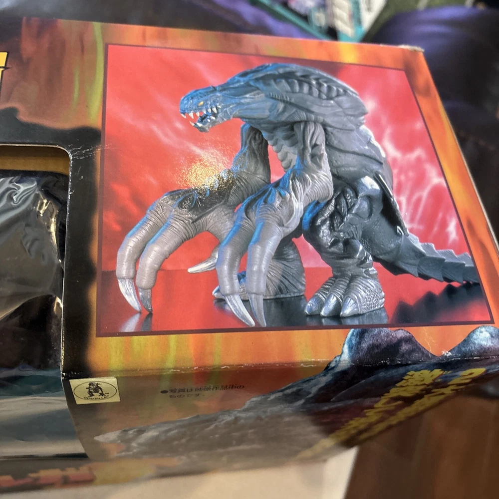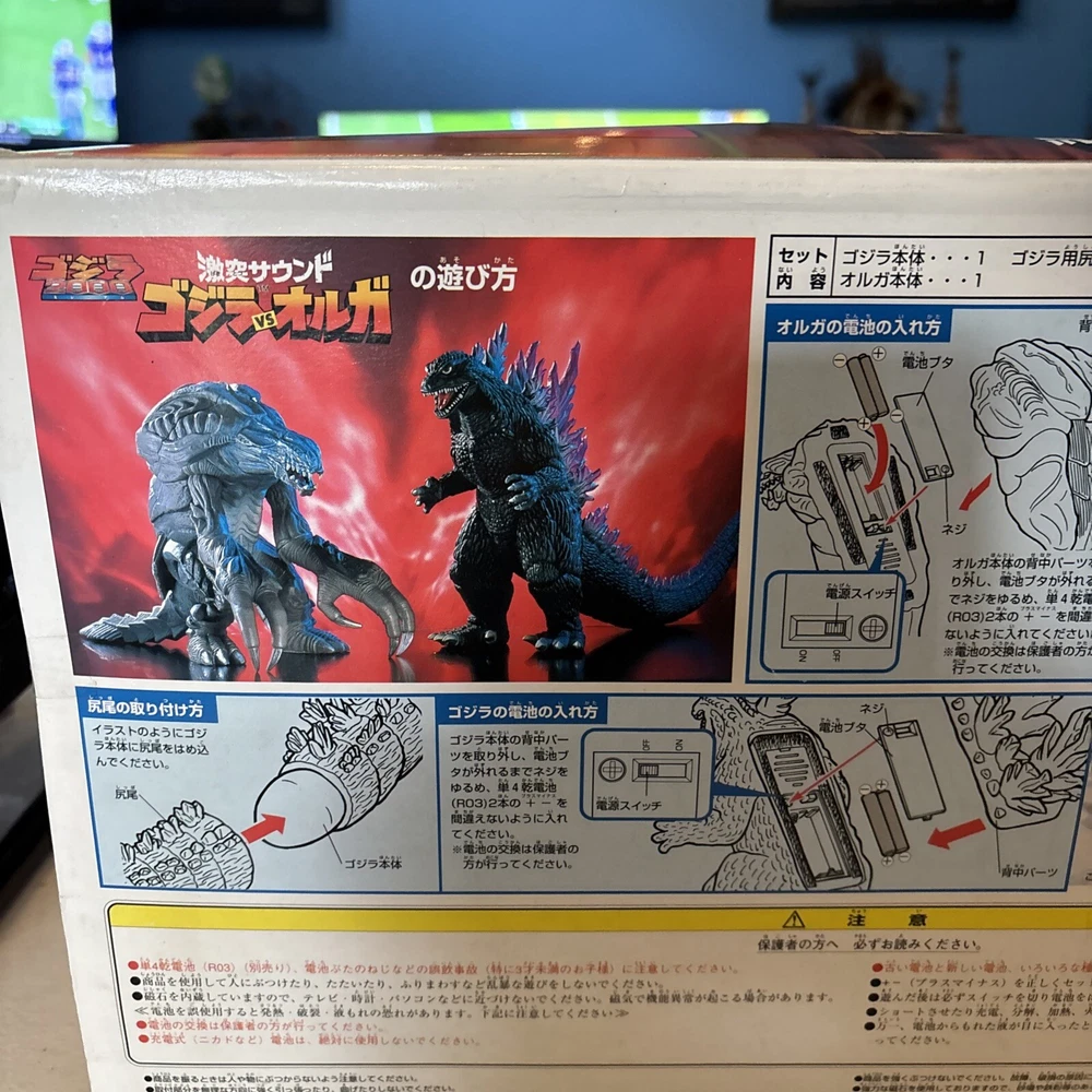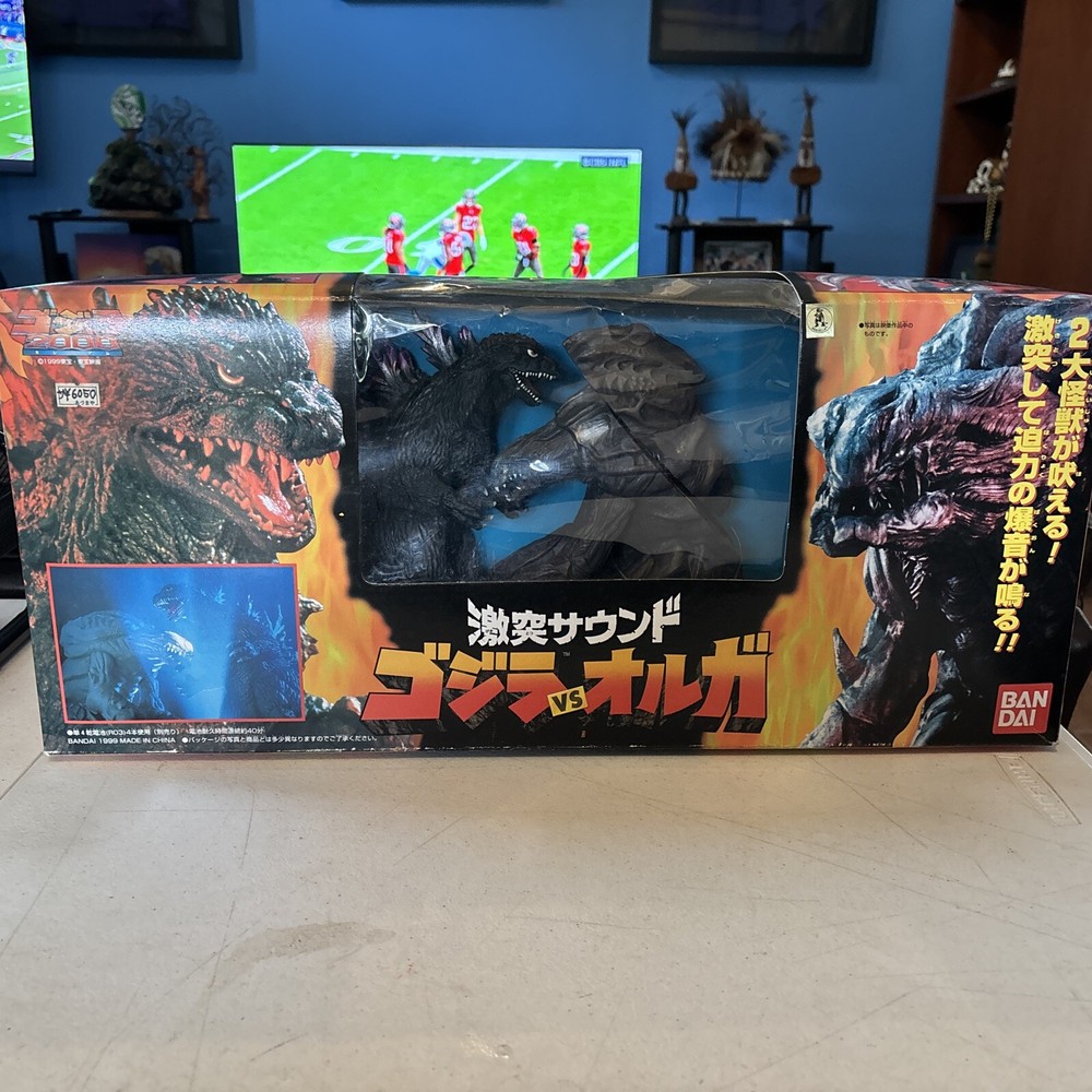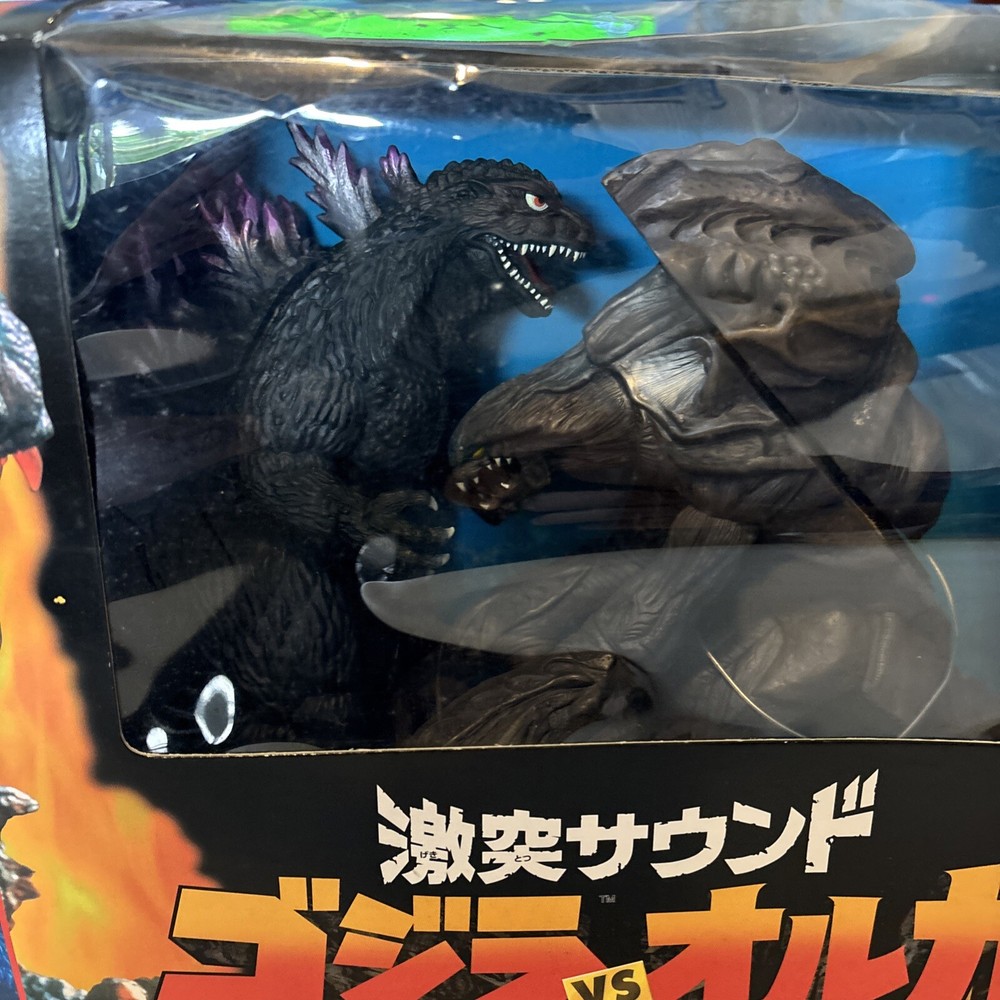 Box never been opened. Over the years factory wires that held figures in place have loosened and figures move a little in box but it has not affected their condition. What you see is what you receive The product is a 1999 Bandai Godzilla vs Orga Sound Battler figure set, featuring a 9-inch Godzilla figure and an 8-inch Orga figure. Both figures are included in the set and are new in their original box. The figures are from Japan and are part of the Godzilla theme, suitable for children ages 3-4 years old. This set offers a fun and engaging way for children to recreate epic battles between these iconic monsters.