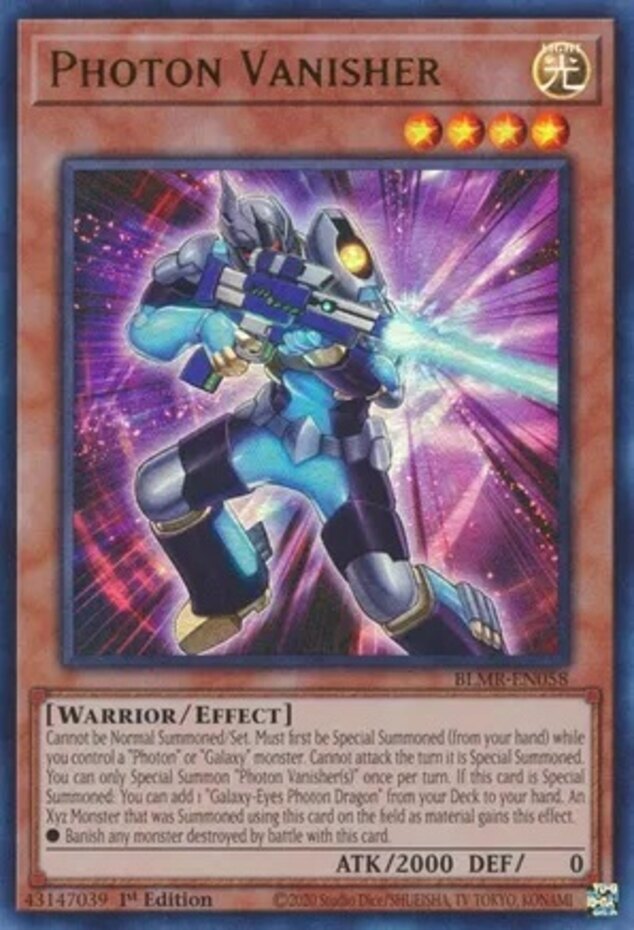 Photon Vanisher - BLMR-EN058 - Ultra Rare - 1st Edition Condition: Near Mint | Language: English ATK/DEF : 2000/0 Attribute : LIGHT Card Number : BLMR-EN058 Card Rules : Card Text : Cannot be Normal Summoned/Set. Must first be Special Summoned (from your hand) while you control a "Photon" or "Galaxy" monster. Cannot attack the turn it is Special Summoned. You can only Special Summon "Photon Vanisher(s)" once per turn. If this card is Special Summoned: You can add 1 "Galaxy-Eyes Photon Dragon" from your Deck to your hand. An Xyz Monster that was Summoned using this card on the field as material gains this effect. • Banish any monster destroyed by battle with this card. Card Type : Effect Monster Edition : 1st Level : 4 Monster Type : Warrior Name : Photon Vanisher Passcode : Pendulum Scale : Rarity : Ultra Rare Set : Battles of Legend: Monstrous Revenge Regular Letter-Post (TCG Singles only, NO Insurance, NO Tracking)