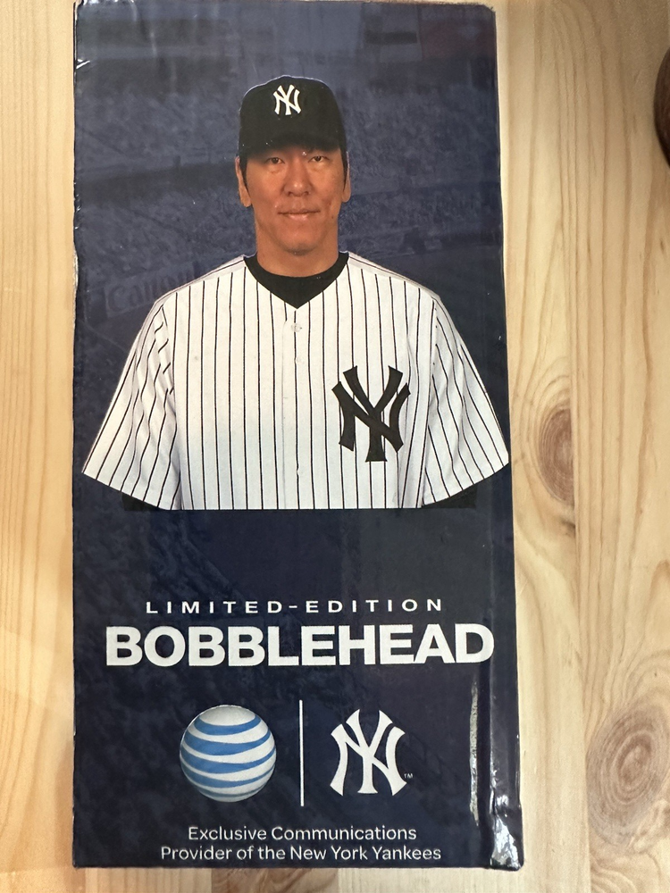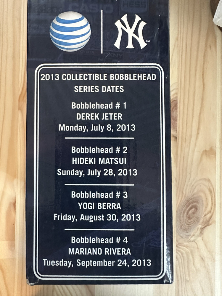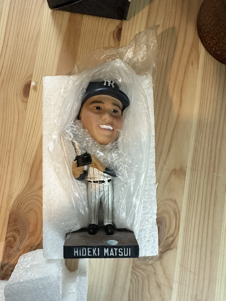 The 2013 Hideki Matsui bobblehead is a vintage sports memorabilia piece that pays homage to the former baseball player. This collectible item features Matsui in his New York Yankees uniform, making it a must-have for fans of both the team and the player. Packaged in its original box, this bobblehead is a unique and nostalgic addition to any sports memorabilia collection. This is a 2013 Hideki Matsui bobblehead , which wasgiven away to the first 18,000 fans at Yankee Stadium on July 28, 2013,as part of a promotional event honoring the former New York Yankee. Thebobblehead features Matsui in his Yankees uniform, holding a bat, and isconsidered a collectible item. This particular bobblehead was given away tocommemorate his 2009 World Series MVP award .