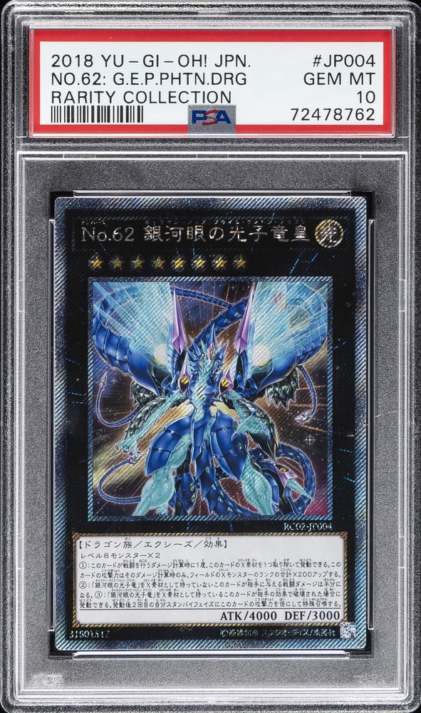 2018 YU-GI-OH! JAPANESE RC02-RARITY COLLECTION #JP004 NUMBER 62: GALAXY-EYES PRIME PHOTON DRAGON PSA 10 2018 YU-GI-OH! JAPANESE RC02-RARITY COLLECTION #JP004 NUMBER 62: GALAXY-EYES PRIME PHOTON DRAGON PSA 10 Purchase Info Thank you for your interest in this item consigned with PSA! By purchasing or making an offer on this item, you acknowledge and agree to the following terms: All sales are final. Returns not accepted. Payment must be made upon purchase of the item. All items are sold "as is" and without warranty of Collectors Universe, Inc. (d/b/a PSA), and ANY AND ALL IMPLIED WARRANTIES ARE DISCLAIMED AND EXCLUDED. Sales tax may apply depending on shipping address. PSA does not guarantee that another third-party grading company's authentication or certification of an item as genuine is correct or accurate. Neither a difference of opinion between third-party grading companies about authenticity, nor a company's subsequent reversal of its earlier authentication or certification of an item, will be a basis for rescinding a sale. Any dispute with another third-party grading company relating to the authenticity of an item must be resolved directly with that other company. Collectors' maximum liability in the event of loss or damage to an item during shipping will be the lesser of (a) the price paid for the item and (b) the change in fair market value of the item. You release Collectors from all other liability including for any claims of punitive damages, emotional distress, consequential damages, lost profits, or lost interest, except as prohibited by law. Shipping Purchased Items will be shipped directly from PSA Vault. You stay hands-free. PSA Vault When you purchase this item, you can save on sales tax and selling fees by keeping it in the PSA Vault, official Vault of eBay. Items already in PSA Vault and will be sent to PSA Vault will have no shipping charge Storage of any items with the PSA Vault will be subject to the PSA Vault Terms of Service. Consignment PSA has competitive rates on the world's largest collectibles marketplace with the option to list from the PSA Vault or immediately after PSA authentication and grading. Sale Price Under $100 $100 - $499 $500 - $999 $1,000 - $2,499 $2,500 - $4,999 $5,000+ Seller Fee 16% 14% 13% 10% 9% 7% Sellers pay a single fee as reflected above; no additional eBay fees are incurred. There is a $5 minimum fee on sold items.