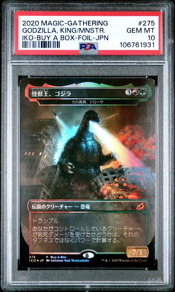 2020 MAGIC THE GATHERING IKORIA: LAIR OF BEHEMOTHS BUY A BOX-FOIL-JAPANESE #275 GODZILLA, KING OF THE MONSTERS PSA 10 2020 MAGIC THE GATHERING IKORIA: LAIR OF BEHEMOTHS BUY A BOX-FOIL-JAPANESE #275 GODZILLA, KING OF THE MONSTERS PSA 10 Purchase Info Thank you for your interest in this item consigned with PSA! By purchasing or making an offer on this item, you acknowledge and agree to the following terms: All sales are final. Returns not accepted. Payment must be made upon purchase of the item. All items are sold "as is" and without warranty of Collectors Universe, Inc. (d/b/a PSA), and ANY AND ALL IMPLIED WARRANTIES ARE DISCLAIMED AND EXCLUDED. Sales tax may apply depending on shipping address. PSA does not guarantee that another third-party grading company's authentication or certification of an item as genuine is correct or accurate. Neither a difference of opinion between third-party grading companies about authenticity, nor a company's subsequent reversal of its earlier authentication or certification of an item, will be a basis for rescinding a sale. Any dispute with another third-party grading company relating to the authenticity of an item must be resolved directly with that other company. Collectors' maximum liability in the event of loss or damage to an item during shipping will be the lesser of (a) the price paid for the item and (b) the change in fair market value of the item. You release Collectors from all other liability including for any claims of punitive damages, emotional distress, consequential damages, lost profits, or lost interest, except as prohibited by law. Shipping Purchased Items will be shipped directly from PSA Vault. You stay hands-free. PSA Vault When you purchase this item, you can save on sales tax and selling fees by keeping it in the PSA Vault, official Vault of eBay. Items already in PSA Vault and will be sent to PSA Vault will have no shipping charge Storage of any items with the PSA Vault will be subject to the PSA Vault Terms of Service. Consignment PSA has competitive rates on the world's largest collectibles marketplace with the option to list from the PSA Vault or immediately after PSA authentication and grading. Sale Price Under $100 $100 - $499 $500 - $999 $1,000 - $2,499 $2,500 - $4,999 $5,000+ Seller Fee 16% 14% 13% 10% 9% 7% Sellers pay a single fee as reflected above; no additional eBay fees are incurred. There is a $5 minimum fee on sold items.