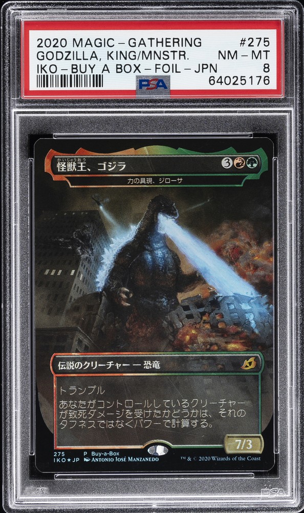 2020 MAGIC THE GATHERING IKORIA: LAIR OF BEHEMOTHS BUY A BOX-FOIL-JAPANESE #275 GODZILLA, KING OF THE MONSTERS PSA 8 2020 MAGIC THE GATHERING IKORIA: LAIR OF BEHEMOTHS BUY A BOX-FOIL-JAPANESE #275 GODZILLA, KING OF THE MONSTERS PSA 8 Purchase Info Thank you for your interest in this item consigned with PSA! By purchasing or making an offer on this item, you acknowledge and agree to the following terms: All sales are final. Returns not accepted. Payment must be made upon purchase of the item. All items are sold "as is" and without warranty of Collectors Universe, Inc. (d/b/a PSA), and ANY AND ALL IMPLIED WARRANTIES ARE DISCLAIMED AND EXCLUDED. Sales tax may apply depending on shipping address. PSA does not guarantee that another third-party grading company's authentication or certification of an item as genuine is correct or accurate. Neither a difference of opinion between third-party grading companies about authenticity, nor a company's subsequent reversal of its earlier authentication or certification of an item, will be a basis for rescinding a sale. Any dispute with another third-party grading company relating to the authenticity of an item must be resolved directly with that other company. Collectors' maximum liability in the event of loss or damage to an item during shipping will be the lesser of (a) the price paid for the item and (b) the change in fair market value of the item. You release Collectors from all other liability including for any claims of punitive damages, emotional distress, consequential damages, lost profits, or lost interest, except as prohibited by law. Shipping Purchased Items will be shipped directly from PSA Vault. You stay hands-free. PSA Vault When you purchase this item, you can save on sales tax and selling fees by keeping it in the PSA Vault, official Vault of eBay. Items already in PSA Vault and will be sent to PSA Vault will have no shipping charge Storage of any items with the PSA Vault will be subject to the PSA Vault Terms of Service. Consignment PSA has competitive rates on the world's largest collectibles marketplace with the option to list from the PSA Vault or immediately after PSA authentication and grading. Sale Price Under $100 $100 - $499 $500 - $999 $1,000 - $2,499 $2,500 - $4,999 $5,000+ Seller Fee 16% 14% 13% 10% 9% 7% Sellers pay a single fee as reflected above; no additional eBay fees are incurred. There is a $5 minimum fee on sold items.