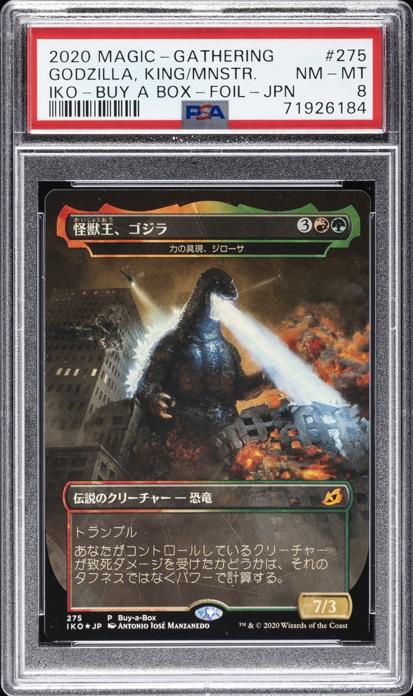 2020 MAGIC THE GATHERING IKORIA: LAIR OF BEHEMOTHS BUY A BOX-FOIL-JAPANESE #275 GODZILLA, KING OF THE MONSTERS PSA 8 2020 MAGIC THE GATHERING IKORIA: LAIR OF BEHEMOTHS BUY A BOX-FOIL-JAPANESE #275 GODZILLA, KING OF THE MONSTERS PSA 8 Purchase Info Thank you for your interest in this item consigned with PSA! By purchasing or making an offer on this item, you acknowledge and agree to the following terms: All sales are final. Returns not accepted. Payment must be made upon purchase of the item. All items are sold "as is" and without warranty of Collectors Universe, Inc. (d/b/a PSA), and ANY AND ALL IMPLIED WARRANTIES ARE DISCLAIMED AND EXCLUDED. Sales tax may apply depending on shipping address. PSA does not guarantee that another third-party grading company's authentication or certification of an item as genuine is correct or accurate. Neither a difference of opinion between third-party grading companies about authenticity, nor a company's subsequent reversal of its earlier authentication or certification of an item, will be a basis for rescinding a sale. Any dispute with another third-party grading company relating to the authenticity of an item must be resolved directly with that other company. Collectors' maximum liability in the event of loss or damage to an item during shipping will be the lesser of (a) the price paid for the item and (b) the change in fair market value of the item. You release Collectors from all other liability including for any claims of punitive damages, emotional distress, consequential damages, lost profits, or lost interest, except as prohibited by law. Shipping Purchased Items will be shipped directly from PSA Vault. You stay hands-free. PSA Vault When you purchase this item, you can save on sales tax and selling fees by keeping it in the PSA Vault, official Vault of eBay. Items already in PSA Vault and will be sent to PSA Vault will have no shipping charge Storage of any items with the PSA Vault will be subject to the PSA Vault Terms of Service. Consignment PSA has competitive rates on the world's largest collectibles marketplace with the option to list from the PSA Vault or immediately after PSA authentication and grading. Sale Price Under $100 $100 - $499 $500 - $999 $1,000 - $2,499 $2,500 - $4,999 $5,000+ Seller Fee 16% 14% 13% 10% 9% 7% Sellers pay a single fee as reflected above; no additional eBay fees are incurred. There is a $5 minimum fee on sold items.