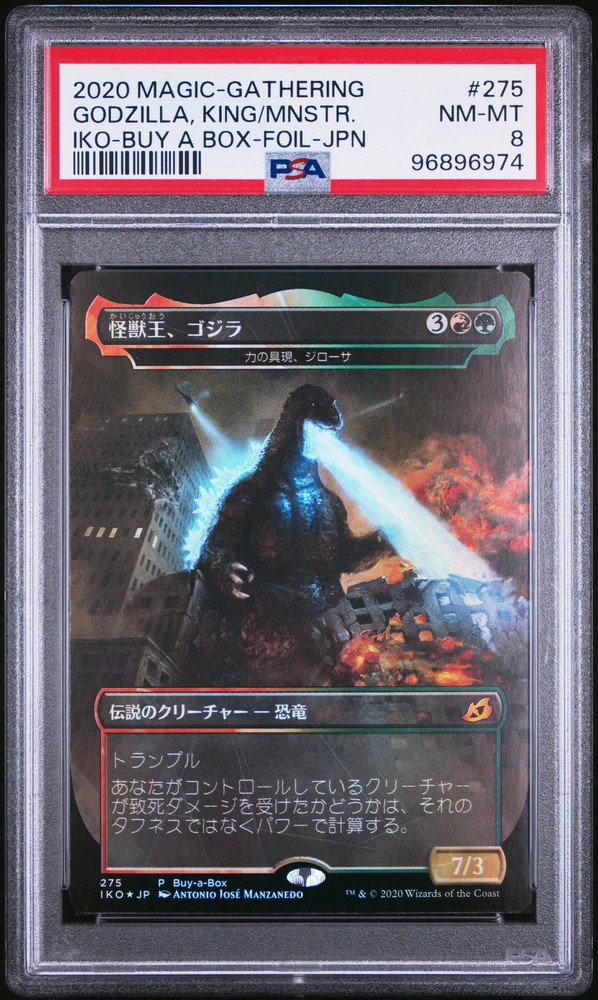 2020 MAGIC THE GATHERING IKORIA: LAIR OF BEHEMOTHS BUY A BOX-FOIL-JAPANESE #275 GODZILLA, KING OF THE MONSTERS PSA 8 2020 MAGIC THE GATHERING IKORIA: LAIR OF BEHEMOTHS BUY A BOX-FOIL-JAPANESE #275 GODZILLA, KING OF THE MONSTERS PSA 8 Purchase Info Thank you for your interest in this item consigned with PSA! By purchasing or making an offer on this item, you acknowledge and agree to the following terms: All sales are final. Returns not accepted. Payment must be made upon purchase of the item. All items are sold "as is" and without warranty of Collectors Universe, Inc. (d/b/a PSA), and ANY AND ALL IMPLIED WARRANTIES ARE DISCLAIMED AND EXCLUDED. Sales tax may apply depending on shipping address. PSA does not guarantee that another third-party grading company's authentication or certification of an item as genuine is correct or accurate. Neither a difference of opinion between third-party grading companies about authenticity, nor a company's subsequent reversal of its earlier authentication or certification of an item, will be a basis for rescinding a sale. Any dispute with another third-party grading company relating to the authenticity of an item must be resolved directly with that other company. Collectors' maximum liability in the event of loss or damage to an item during shipping will be the lesser of (a) the price paid for the item and (b) the change in fair market value of the item. You release Collectors from all other liability including for any claims of punitive damages, emotional distress, consequential damages, lost profits, or lost interest, except as prohibited by law. Shipping Purchased Items will be shipped directly from PSA Vault. You stay hands-free. PSA Vault When you purchase this item, you can save on sales tax and selling fees by keeping it in the PSA Vault, official Vault of eBay. Items already in PSA Vault and will be sent to PSA Vault will have no shipping charge Storage of any items with the PSA Vault will be subject to the PSA Vault Terms of Service. Consignment PSA has competitive rates on the world's largest collectibles marketplace with the option to list from the PSA Vault or immediately after PSA authentication and grading. Sale Price Under $100 $100 - $499 $500 - $999 $1,000 - $2,499 $2,500 - $4,999 $5,000+ Seller Fee 16% 14% 13% 10% 9% 7% Sellers pay a single fee as reflected above; no additional eBay fees are incurred. There is a $5 minimum fee on sold items.