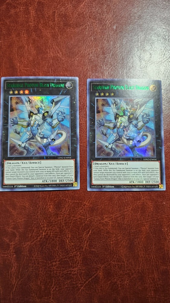 You are getting: 2X LDS2-EN054 Starliege Photon Blast Dragon Ultra Rare 1st Edition YuGiOh GREEN All cards comes with a top loader to ensure that your card is in the condition mentioned. I do NEXT BUSINESS DAY SHIPPING so you can get your card(s) as soon as possible and I do FREE SHIPPING ON ALL ITEMS! Buy with confidence as we have 100% customer satisfaction :) Check my Store f or more awesome items all with free shipping! Let me know if you have any questions.