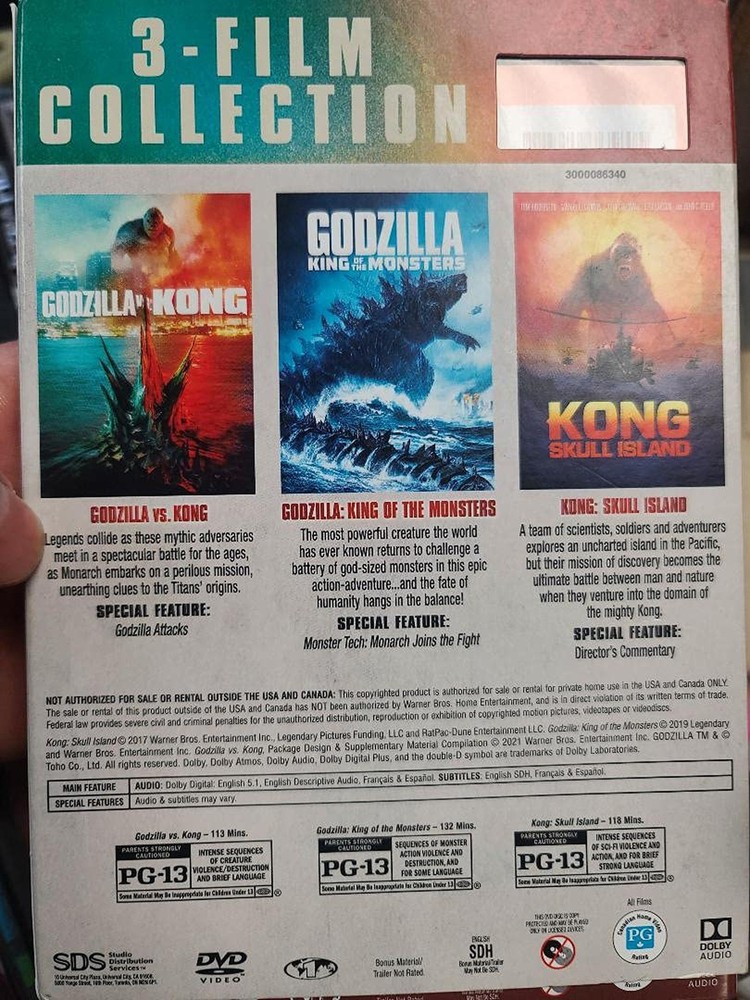 3-Film Collection - Godzilla Vs. Kong/Godzilla: King Of The Monsters/Kong: Skull Island DVD [DVD] Product Overview Format: DVD, DVD Details Is Discontinued By Manufacturer : No Package Dimensions : 7.6 x 5.55 x 0.71 inches; 0.32 ounces Media Format : DVD Best Sellers Rank: #131,477 in Movies & TV (See Top 100 in Movies & TV) #94,233 in DVD #94,233 in DVD Customer Reviews: 4.6 4.6 out of 5 stars 57 ratings Quality Products Have peace of mind knowing that your order will arrive original factory sealed packaging. That means that you'll have the full force of the manufacturer's warranty to protect your purchase. Fast and Free Shipping You're already purchasing the item. Why pay additional for shipping, especially slow shipping? We get your order shipped out and delivered to your doorstep as quickly as possible. Commitment We are committed to making sure that you leave this transaction satisfied. That means having access to real people that get your questions and concerns answered quickly. Give us a shot and we will make sure that you will look to us again!