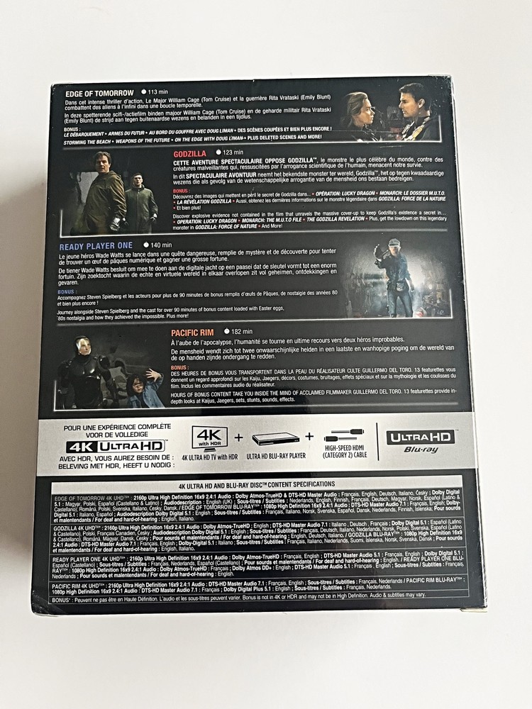 Up for sale on a Brand New Four-Movies 4K-UHD/Blu-ray Box-Set Bundle Collection, Belgium Release, Region Free [play on any blu-ray player worldwide] INCLUDES 1] Edge of Tomorrow [4K-UHD + Blu-ray] 2] Godzilla [4K-UHD + Blu-ray] 3] Ready Player One [4K-UHD + Blu-ray] 4] Pacific Rim [4K-UHD + Blu-ray] This Box-Set is originally from Belgium but has Audio / Menu in English, just packaging / artwork in in French / Dutch The Box-Set may show some tearing on the plastic wrapping or small wrinkle on one corner of the box-set, nothing noticeable OOS/OOP! SOLD OUT! RARE! It will be shipped in a sturdy box for security purposes not a bubble mailer like some others sellers You are looking at the item you will receive. I don’t use stock photos PAYMENTS I only accept PayPal payments Payments are expected after the auction is closed and are due within 3 days from the end of the auction or it will open automatically an unpaid case by eBay SHIPPING All orders are handled in 1 business day You will receive a tracking information via email when your item is delivery All steelbooks/Blu-ray always will be packaged in a box with bubble wrap for security purposes STEELBOOK / BOX-SET DISCLAIMER I examined each steelbook/box-set before I shipped it, and it sometimes has microdents and light scratches underneath the wrapping and j-card / data card that can only be seen when the wrapping is taken off You have to check before you opened it, NO RETURNS OR REFUNDS WILL BE ACCEPTED IF YOU OPEN THE STEELBOOK I cannot be responsible for the Region Coding. Please research and verify for yourself prior to buying All steelbooks/box-set leave my possession with the discs secured inside the steelbook. If a disc comes loose in transit, I am not responsible, no returns or partial refunds will be allowed By buying, you are accepting my policies and acknowledge that you have read and agree to my terms! Feel free to contact me with any questions Good luck and thanks for looking!!!