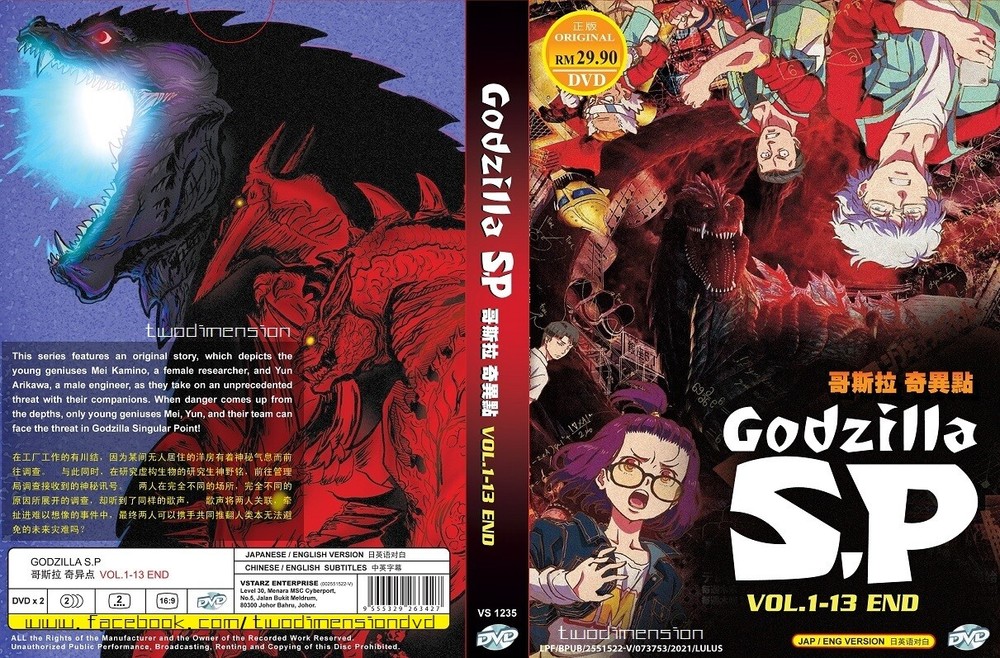 GODZILA S.P - COMPLETE TV SERIES with ENGLISH DUBBED Japanese Animation Synopsis : This series features an original story, which depicts the young geniuses Mei Kamino, a female researcher, and Yun Arikawa, a male engineer, as they take on an unprecedented threat with their companions. When danger comes up from the depths, only young geniuses Mei, Yun, and their team can face the threat in Godzilla Singular Point! Condition: NEW, Original & Licensed Item Format: ALL Region Language: Japanese / English Subtitle: English / Chinese Number of Episodes: 1 β 13 (End) Number of Discs: 1 ** We will throw in a FREE GIFT (merchandise) randomly. ** Shipping & Handling : - We provide WORLDWIDE SHIPPING . (But we DO NOT ship to NORTH KOREA , ISRAEL and SYRIA ) - We offer FREE SHIPPING to WORLDWIDE by using economy registered airmail with tracking number . Delivery time for economy shipping normally takes within 14 - 21 working days. - All DVDs will be bubble wrapped for better protection. - All parcel will be dispatched out from Malaysia within 1 -3 working days after payment has cleared. - An ebay message will be sent to your inbox after your parcel has been dispatched out along with the registration number for tracking purposes. Payment Details : - We accept ONLY PAYPAL payments. We are PayPal Verified, buy with confidence. - IMMEDIATE PAYMENT is required. Thank you. Customs Fees , Import Duties and Tariffs (FOR DHL EXPRESS) : - International shipments may be subjected to additional custom fees and duties. We DO NOT pre-bill any import duties , customs fees or tariffs imposed by various government on the product. - Import duties and taxes may be applied to certain countries and varies from country to country. C ustoms fees is incurred for customs clearance or import sales tax is levied on deliveries , the charges shall be borne by the BUYERS . - Buyers have to clarify the customs laws and regulations with the local authorities to obtain specific information BEFORE PURCHASE . Return Policy : - All item are not REFUNDABLE and RETURNABLE . Please take note. Contact Us : - If you have any questions or requests, please feel free to contact us. We will do our best to reply to you as soon as possible. Thank you. Thank you for considering twodimensiondvd ! Please check out our store for more great DVDs : Click Here To Visit Our Store ! Sign up our newsletter to receive more New DVDs info : Click Here To Sign Up ! Powered by SoldEazy