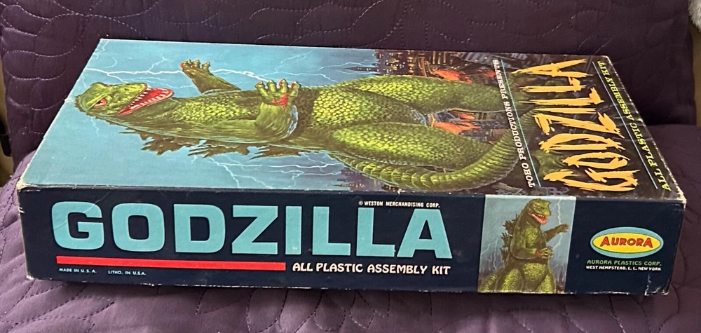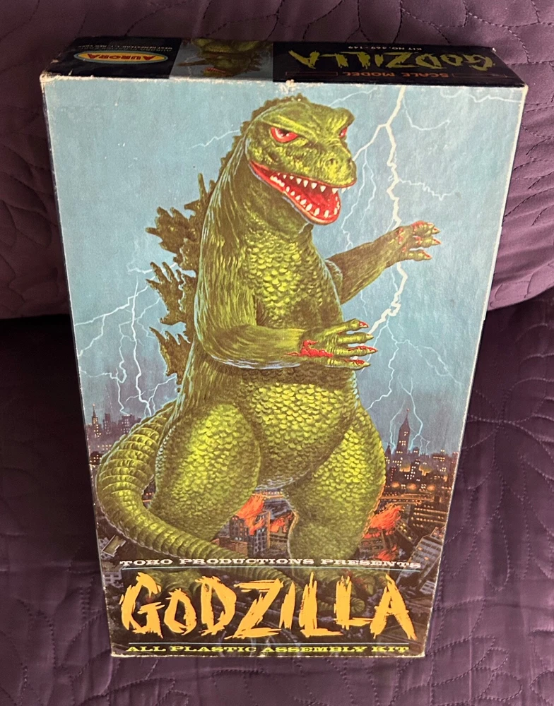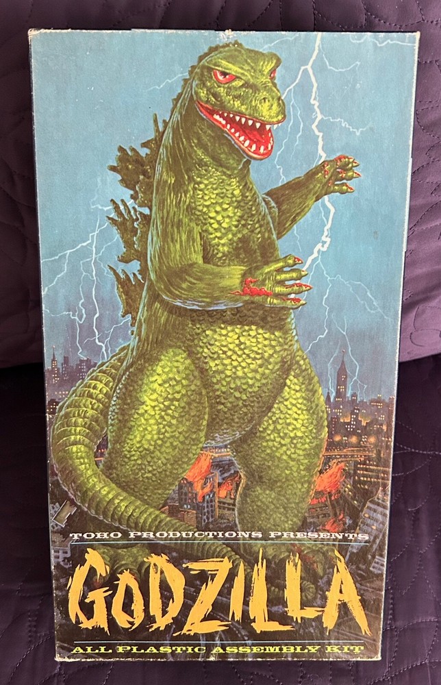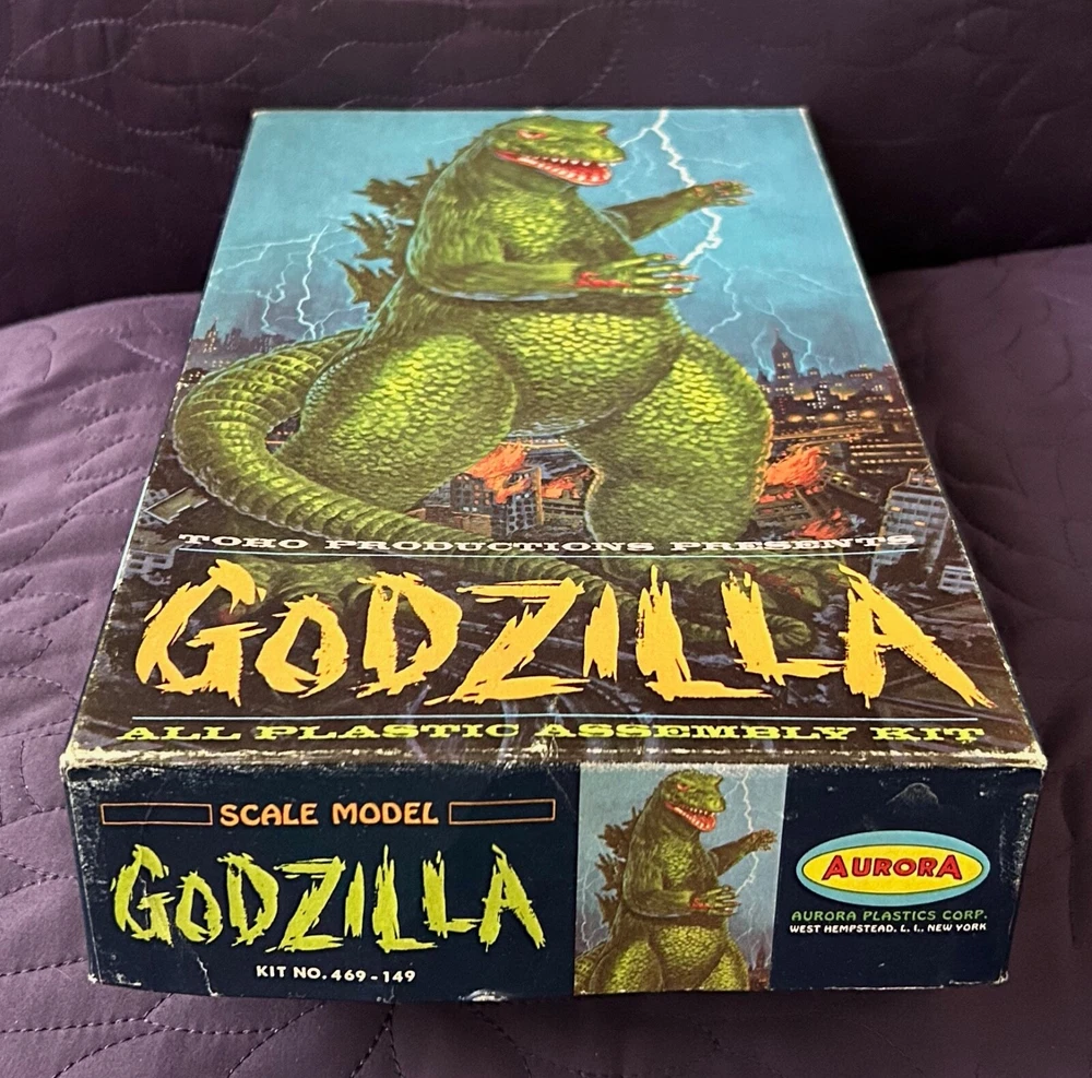 AURORA GODZILLA MODEL KIT BOX 469 1964 LID ONLY NO KIT NO BOTTOM Very good displayable condition. Some edge and corner wear. Some creasing to side panels and top and bottom panels. Some creasing to top. No major damage or split corners. Very good or better. Box lid only. No bottom. No kit. Ships double boxed for safe travel. Fully insured with signature confirmation .
