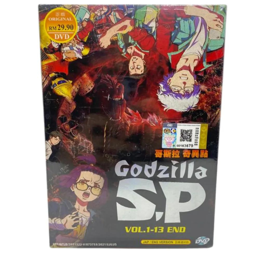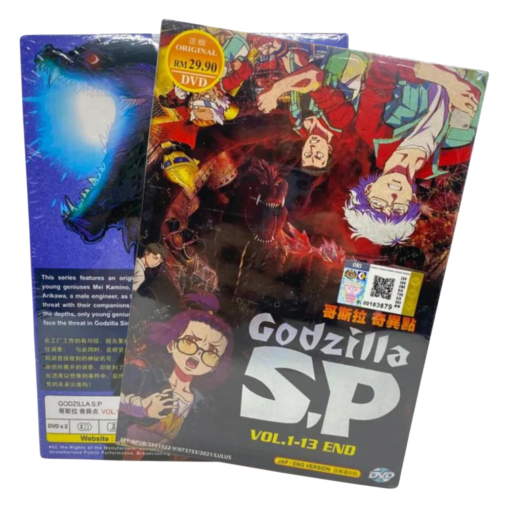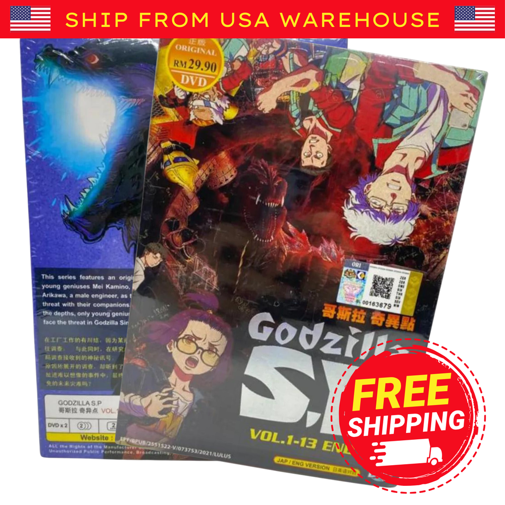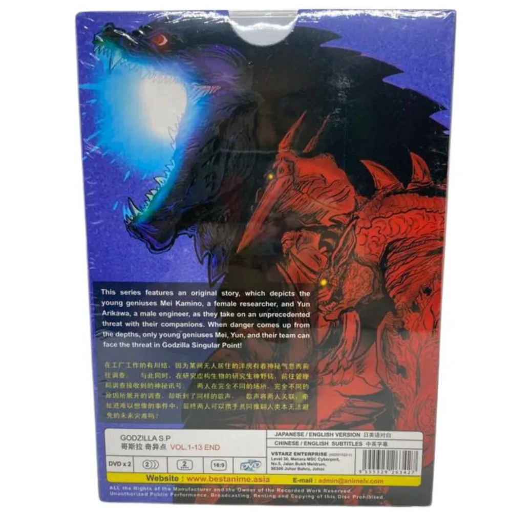 Godzilla S.P Complete TV Series *English Dubbed* Item Descriptions: Godzilla S.P Vol.1-13 End Audio Language: English / Japanese Subtitles: English / Chinese No. of Discs: 2 DVDs Region Code: ALL Region, Region FREE "0" (Able to play on DVD Players throughout the World) Synopsis: This series features an original story, which depicts the young geniuses Mei Kamino, a female researcher, and Yun Arikawa, a male engineer, as they take on an unprecedented threat with their companions. When danger comes up from the depths, only young geniuses Mei, Yun, and their team can face the threat in Godzilla Singular Point!