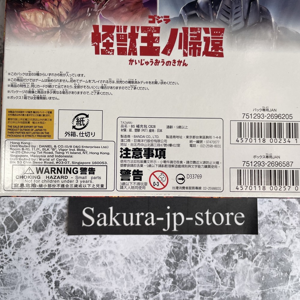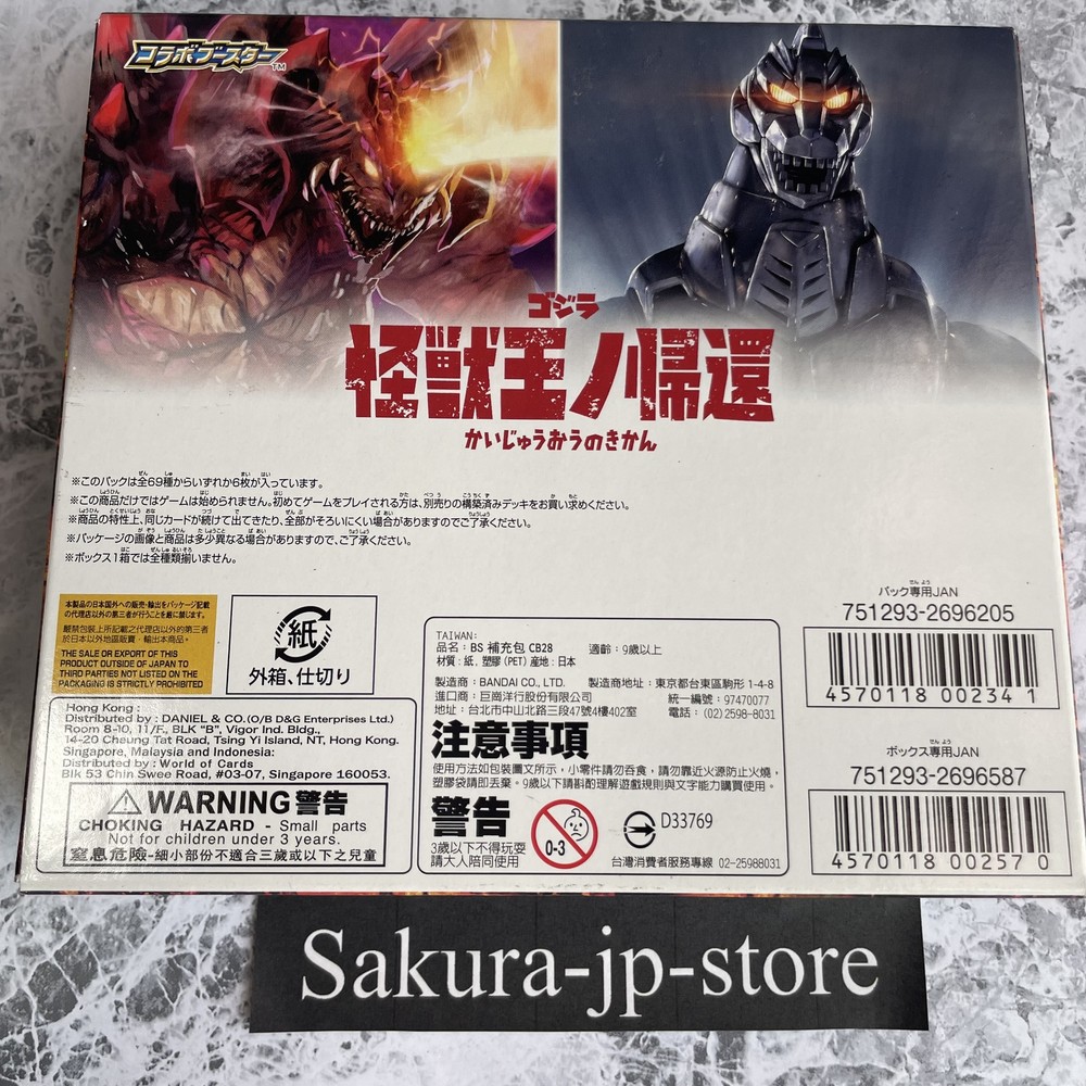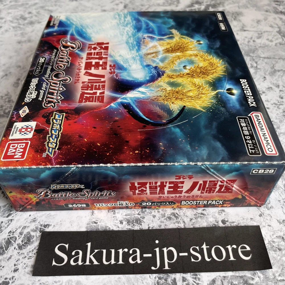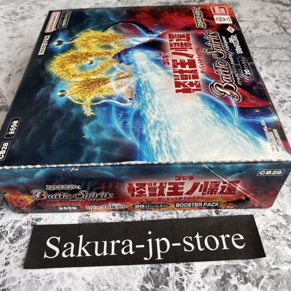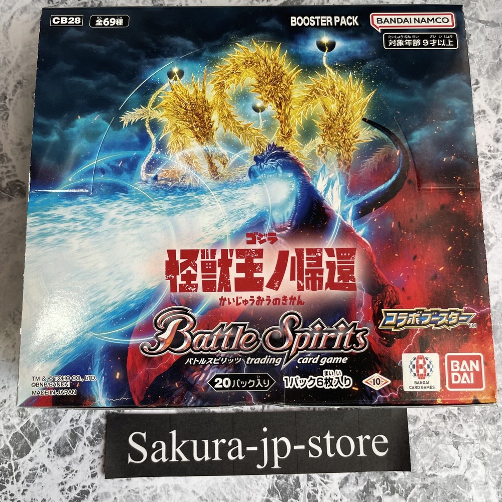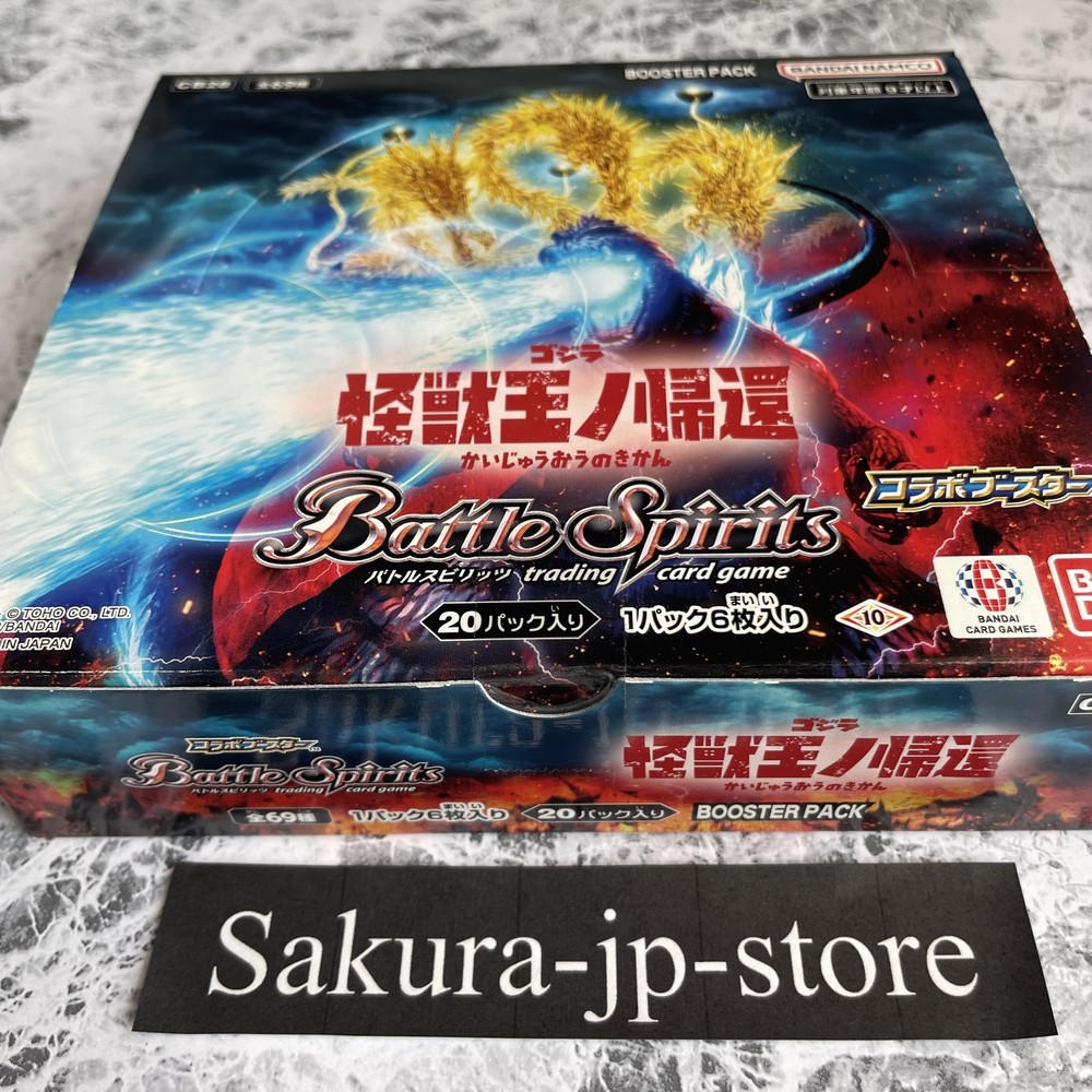 BANDAI Battle Spirits Godzilla Return Of The King Of Monsters Booster Japan New Description Condition: New BANDAI Battle Spirits Godzilla Return Of The King Of Monsters Booster Japan New [CB28] (BOX) 20 packs Payment Please pay within 5 days after the auction closed. International Buyers; Please Note: Import duties, taxes, and charges are not included in the item price or shipping cost. These charges are the buyer's responsibility. Please check with your country's customs office to determine what these additional costs will be prior to bidding or buying. We never accept undervalue offers. Shipping About other area, please ask me. 【Handling time】 We cannot ship on Saturdays, Sundays and Japan holidays. In the case of reserved products, the shipping procedure will be after the sale. Regardless of the delivery method, there may be a delay in delivery time than expected during customs waiting periods, postal delays, and busy periods such as the holiday season. Returns Returns are accepted ONLY if the item was not the item described. International Buyers - Please Note: * Import duties, taxes and charges are not included in the item price or shipping charges. These charges are the buyer's responsibility. * Please check with your country's customs office to determine what these additional costs will be prior to bidding/buying. * These charges are normally collected by the delivering freight (shipping) company or when you pick the item up - do not confuse them for additional shipping charges. * We do not mark merchandise values below value or mark items as "gifts" - US and International government regulations prohibit such behavior. About us Thank you for visiting my page. We am very passionate about quality Japanese products. We want to deliver good Japanese products to people all over the world through ebay. We am always trying to give you the peace of mind by offering a courteous and fast service. Please feel free to contact us if you have any questions. We will surely help you.