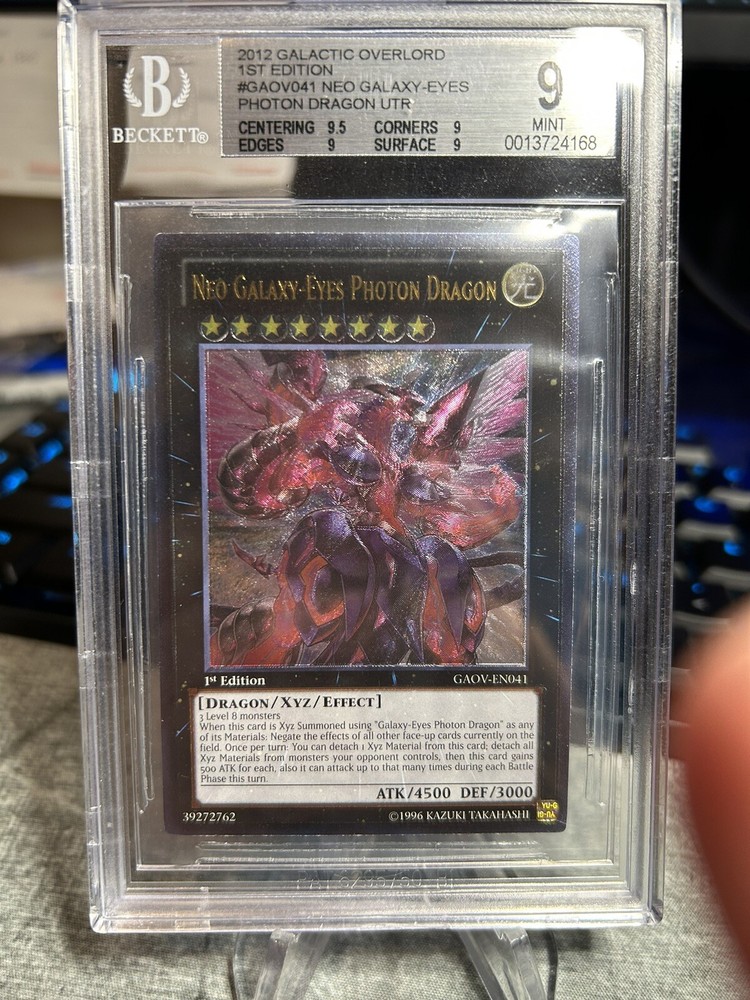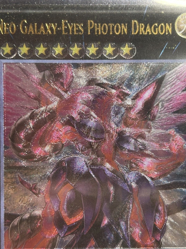BGS 9 ERROR Neo Galaxy-Eyes Photon Dragon GAOV-EN041 1st Edition Ultimate. Yugioh For sale is this amazing error Neo Galaxy Eyes Photon Dragon. The error is that it has been stamped with the texture for the ultimate rare twice, which is easier to tell by looking at the edges of the monster image. Because of the double stamp, the image looks almost blurred as you can see from the photo. Great error graded by BGS. Let me know if you have any questions or need more photos.