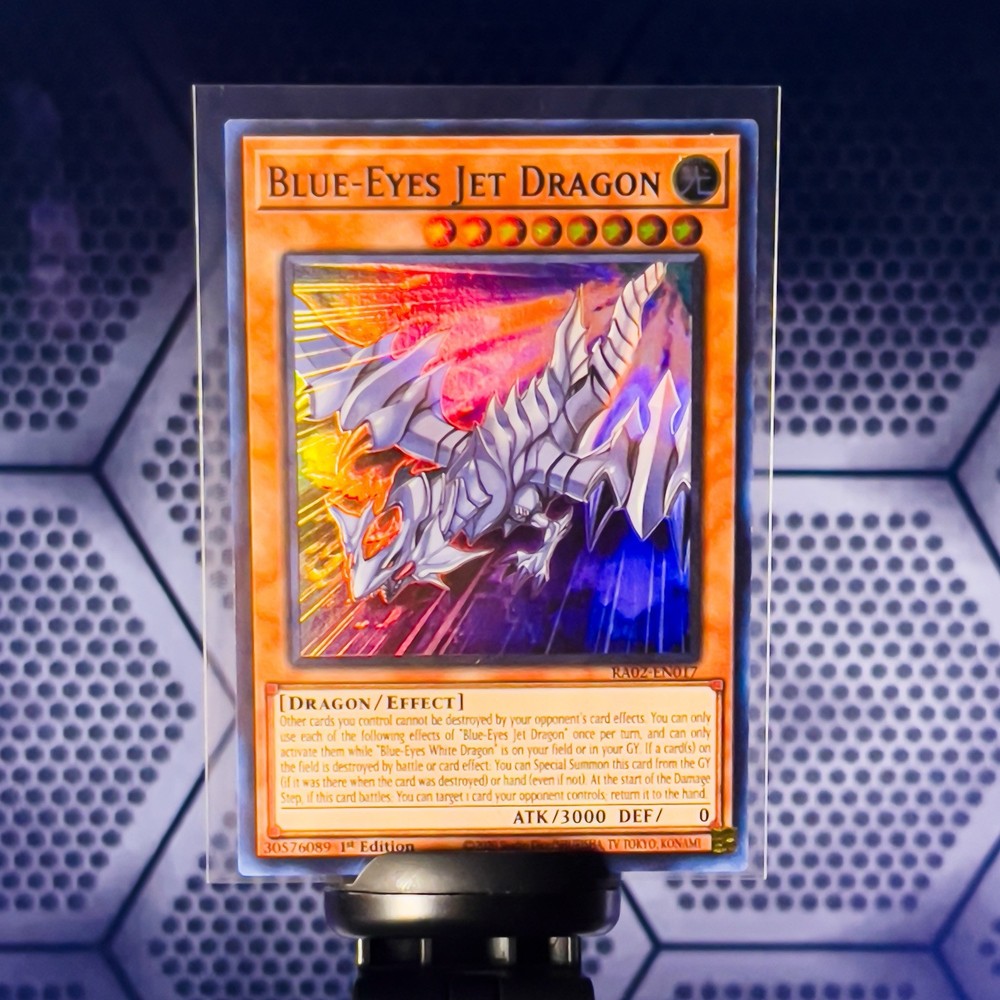 The "Blue-Eyes Jet Dragon" card is an ultra rare, 1st Edition, holo card from the Yu-Gi-Oh! TCG manufactured by Konami. It features the Dragon creature type and has a blue color scheme. The card is made of card stock material and is standard in size. With its Galaxy-Eyes Photon Dragon design, this collectible card is a sought-after addition for fans and collectors of the Yu-Gi-Oh! trading card game.