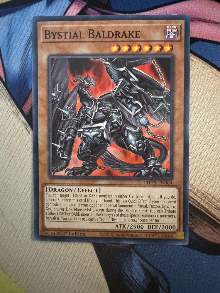 | Card Text | You can target 1 LIGHT or DARK monster in either GY; banish it, and if you do, Special Summon this card from your hand. This is a Quick Effect if your opponent controls a monster. If your opponent Special Summons a Ritual, Fusion, Synchro, Xyz, and/or Link Monster(s) (except during the Damage Step): You can Tribute 1 other LIGHT or DARK monster, then target 1 of those Special Summoned monsters; banish it. You can only use each effect of "Bystial Baldrake" once per turn. |