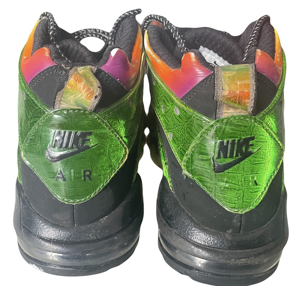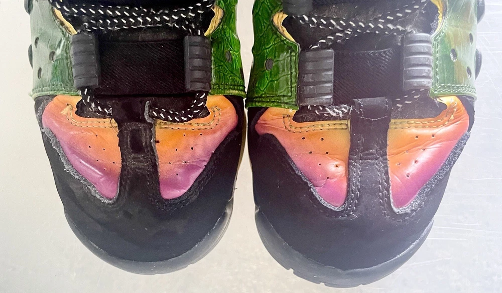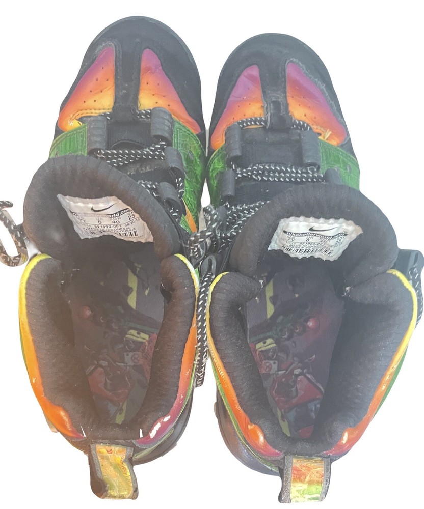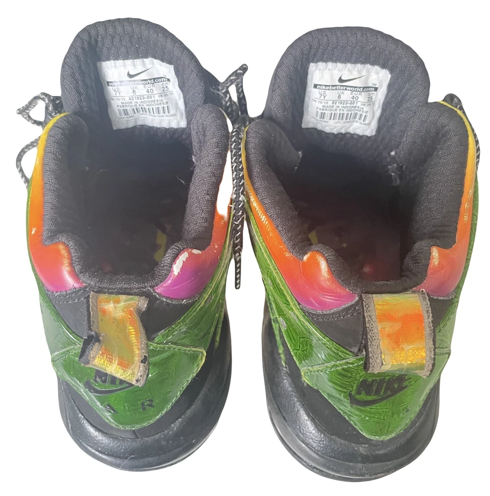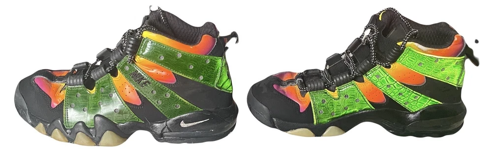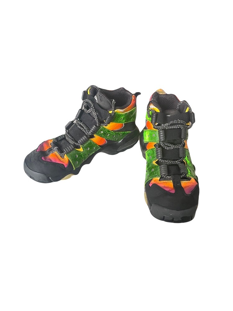 This limited edition Nike Air Max2 sneaker, designed with a colorful Godzilla pattern, is the perfect addition to any shoe collection. The mid-top silhouette, with a lace-up closure, provides a standard shoe width and a comfortable fit for any occasion, whether it's activewear, casual or workwear. The outsole material is made up of leather, vinyl, and unknown materials, while the upper material is vinyl. The shoe is perfect for winter, summer, fall and spring seasons. It’s also suitable for various activities, including basketball, running, tennis, yoga, and more. This pair of Nike Air Max2 sneakers, released in 2015, is a must-have for any sneaker enthusiast. Condition: Pre-owned with moderate wear. See photos for some wear, but not all wear is shown in photos. Partial scuffs, marks with chafing on fabric in areas. Shoelaces have wear and are somewhat coming apart. Inside bottoms feel fine. They could easily be worn by a male or a female. Since they are pre-worn, new foot inserts are recommended (not required or included) so that they can better fit your own feet. Tag: US: 7Y UK: 6 EUR: 40 06/10/15 821923-001 08/20/15 MADE IN INDONESIA UPC: 00091208182865