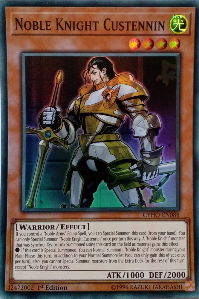 CYHO-EN088 NOBLE KNIGHT CUSTENNIN SUPER RARE 1ST EDITION ALL YU-GI-OH CARDS I SELL ARE KONAMI TOURNAMENT LEGAL. CARDS ARE ALL NEAR MINT TO LIGHTLY PLAYED CONDITION POSTAGE IS FREE SO YOU CAN BUY AS MANY CARDS AS YOU WANT FROM US AND NOT PAY A PENNY POSTAGE. IF YOU HAVE ANY QUESTIONS PLEASE FEEL FREE TO CONTACT ME. Track Page Views Wi4.9 Auctiva's FREE Counter