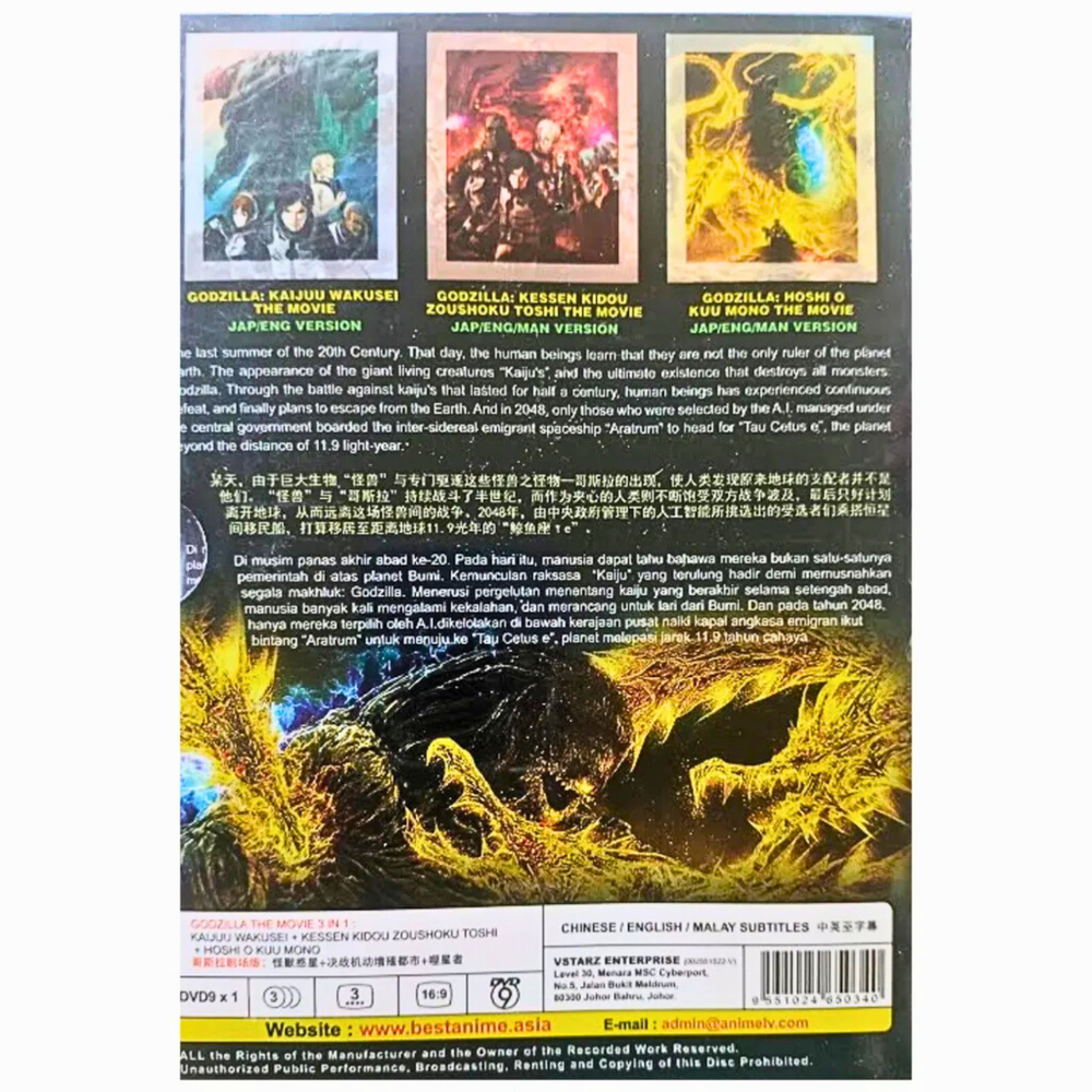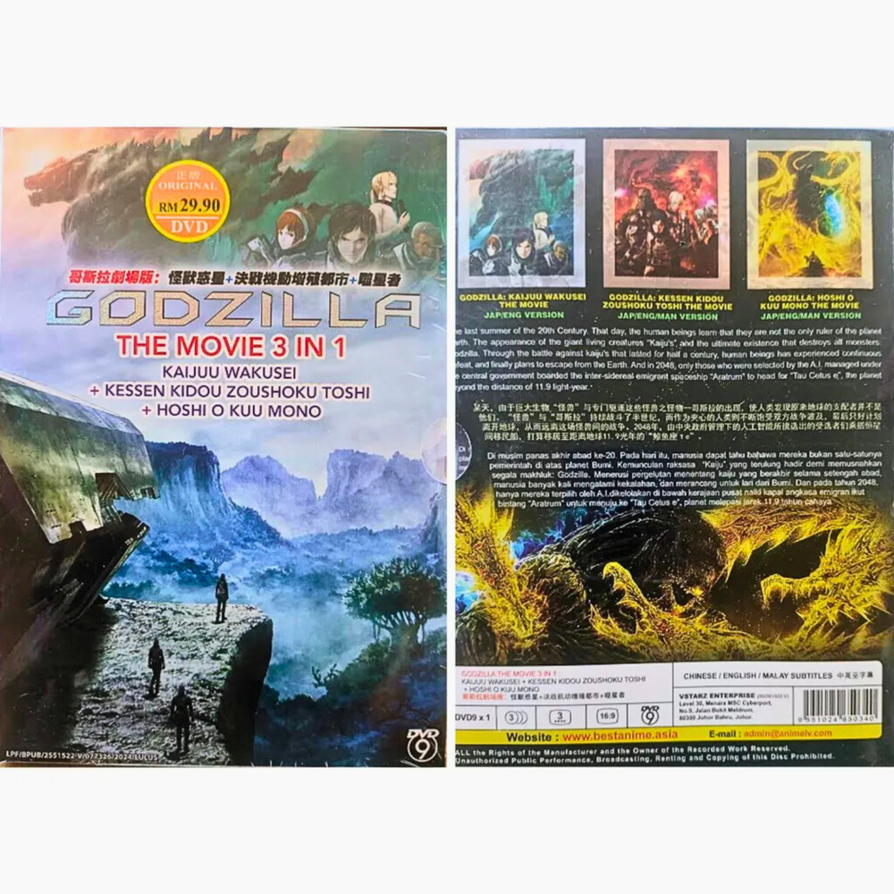 Title : DVD Godzilla The Movie 3in1 Kaijuu Wakusei+Kessen Kidou+Hoshi O Kuu Mono Godzilla The Movie 3 in 1: Kaijuu Wakusei / Kessen Kidou Zoushoku Toshi / Hoshi wo Kuu Mono - *English Dubbed* Product Description: Number of Disc. : 1 DVD Episodes : 3 Movies Audio (Dialogue): English / Japanese Subtitled : English / Chinese / Malay DVD Region Code : Region Free, All (NTSC) Shipping The products will be shipped via International Standard Shipping from Malaysia. Handling time is 1-3 working days. Your goods will be shipped with a valid tracking number. All products are packed and layered with bubble wrap to reduce damages during shipment delivery. Estimate delivery is between 11 to 23 business days. Returns If you have any problem with the order, do contact us via ebay message. We are glad to assist you and solving the problem as soon as possible. Other Note: Import duties, taxes, and additional charges are not included in the item price or shipping charges. Please be aware that custom import duties and taxes are buyer's responsibility.