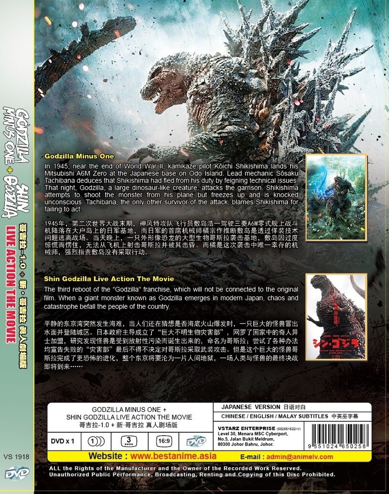 Title : Godzilla Minus One (2023 Film) + Shin Godzilla (2016 Film) Condition : Brand NEW Region Code : All Region Language : Japanese Subtitle : English / Chinese No. Of Disc & Format :1 Disc DVD We Only Sell Original / Genuine DVDs. DVD All Selling Publisher Licensed In Malaysia. All DVDs Come With Hologram By Malaysia Censorship Board. All DVDs is Region FREE, Playable Worldwide. FREE Shipping Worldwide By Registered AirMail with Tracking Numbers 10 ~ 21 Days Without Sat & Sun Days Working Days. Return 14 Days No Question Ask Return . Buyer Pay Return Postage Contact Us If You Have Any Questions Please E-Mail Me Feedback Should Any Problem Arise, Please E-Mail Let US Know & We Will Do Our To Correct Any Problems.