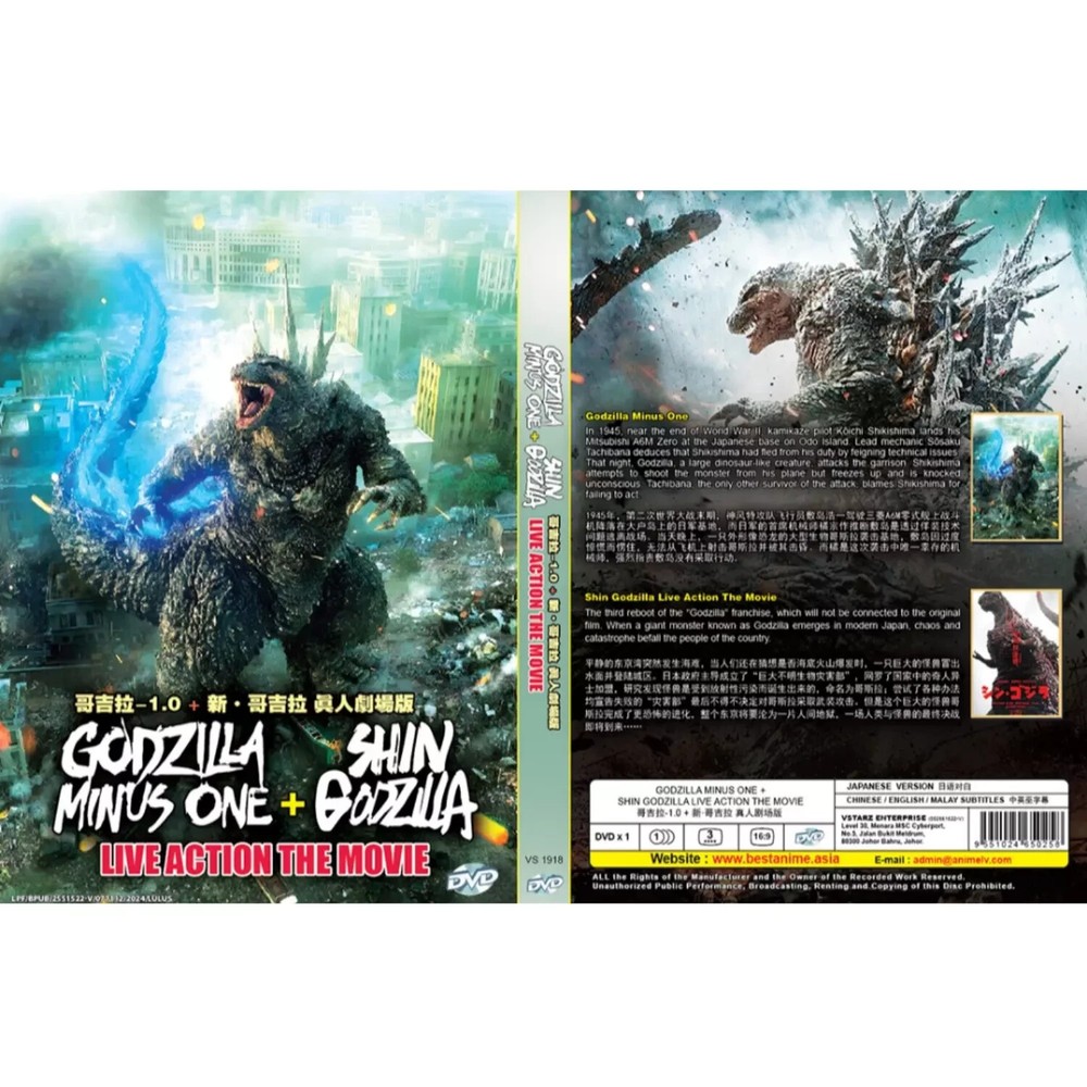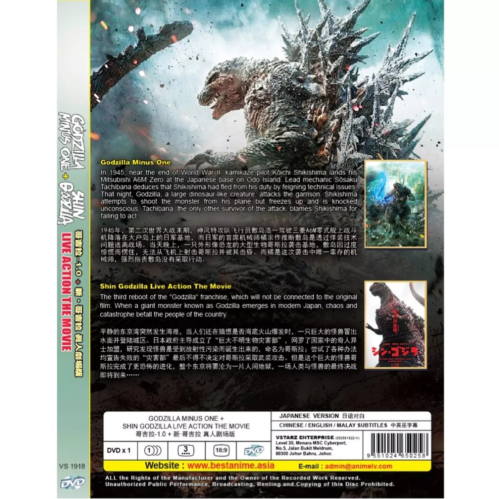 Title Name: Godzilla Minus One [2023] + Shin Godzilla [2016] No of Disc: 1 Disc Language: Japanese Subtitles: English/Chinese/Malay Format: DVD (Widescreen 16:9), All Region Genres: Action, Sci-Fi Starring: Ryunosuke Kamiki, Minami Hamabe, Yuki Yamand Godzilla Minus One ( ゴジラ-1.0(マイナスワン) , Gojira Mainasu Wan ) is a 2023 Japanese epic [a] kaiju film written, directed, and with visual effects by Takashi Yamazaki . Produced by Toho Studios and Robot Communications and distributed by Toho , [1] it is the 37th film in the Godzilla franchise , Toho's 33rd Godzilla film, and the fifth film in the franchise's Reiwa era . [b] The film stars Ryunosuke Kamiki , Minami Hamabe , Yuki Yamada , Munetaka Aoki , Hidetaka Yoshioka , Sakura Ando and Kuranosuke Sasaki . Set in postwar Japan , it follows a former kamikaze pilot suffering from post-traumatic stress disorder after encountering a giant monster known as " Godzilla ". Following Shin Godzilla (2016), Toho was unable to produce another live-action Godzilla film until 2020, owing to a contract with Legendary Entertainment . Producer Minami Ichikawa appointed Yamazaki to create the film upon the completion of The Great War of Archimedes (2019). Principal photography was postponed due to the COVID-19 pandemic , leaving Yamazaki three years to write the script, which draws inspiration from previous Godzilla movies and the works of Hayao Miyazaki and Steven Spielberg . In February 2022, Robot Communications publicized that Yamazaki would soon direct an untitled kaiju movie. Filming occurred primarily in Chūbu and Kantō from March to June 2022. Shirogumi 's Chōfu studio spent eight months creating the visual effects. The film was revealed to be an installment in the Godzilla series in November 2022, and its title was announced in July 2023. Godzilla Minus One premiered at the Shinjuku Toho Building on October 18, 2023, and was released in Japan on November 3, to celebrate the franchise's 70th anniversary. [c] Toho International later released it in North America on December 1. The film grossed almost $116 million worldwide on an estimated $10–12 million budget, becoming the third-highest-grossing Japanese film of 2023 and surpassing Shin Godzilla as the most successful Japanese Godzilla film. Critics praised its visual effects, direction, screenplay, characters, and social commentary, with many hailing it as one of the best films of 2023 and among the greatest in the Godzilla franchise. It also attained numerous accolades , including a leading 12 nominations at the 47th Japan Academy Film Prize (winning eight), three nominations at the 17th Asian Film Awards (winning two), and winning Best Visual Effects at the 96th Academy Awards . Company Shipping and Return Policy Shipping Method Orders will be dispatched within 3-5 business days following payment receipt, excluding weekends and Malaysia public holidays (e.g., Christmas, Chinese New Year). All shipments to the USA will include a tracking number and will be handled by a reliable courier service. Commitment to Customer Satisfaction We are dedicated to providing an exceptional shopping experience. Should you be unsatisfied with your order, please contact us through eBay Messaging, providing your contact information and order number. Our business hours are Monday through Friday, and we strive to respond to all inquiries within one business day. Feedback Your feedback is crucial to us. If any aspect of your shopping experience does not meet your expectations, please contact us immediately before leaving feedback. We are committed to resolving any issues to your satisfaction. Use eBay Messaging and include your contact information and order number for assistance. Shipping Details We ship to the USA using standard or expedited shipping services. Tracking numbers will be provided once the item is shipped. Please allow 3-5 business days for the tracking information to become active after the tracking number is updated. Buyers are responsible for any applicable customs duties and taxes. Ensure your address is correct before making a purchase. If an incorrect address is provided and the item has not yet shipped, contact us immediately to update the address. In the event of delivery delays due to unforeseen circumstances within the shipping service's scope, we appreciate your patience and understanding as we work to resolve the issue. Return Policy Our return policy is in accordance with eBay's Return Policy. We offer refunds for items that arrive damaged, do not match the listing description, or are incorrect, as covered under the eBay Money Back Guarantee. Please retain all packaging if the item is damaged during shipping, as we may request photos to file a reimbursement claim with the shipping service. If you choose to return an item that has already shipped, it must be in the same condition as when it was sent. Refund Terms and Conditions: Items must be returned within the period specified in the listing, with return shipping costs covered by the seller. Items must be in their original condition, unused, uninstalled, and without any missing parts or damage to the retail packaging. We are not responsible for return shipments lost or damaged during transit. For hygiene reasons, we do not accept returns for innerwear such as socks, swimwear, and underwear. Refunds will be issued within 2 business days of receiving and inspecting the returned item. Returns that do not meet these conditions will not be accepted. Thank You for Shopping with Us!