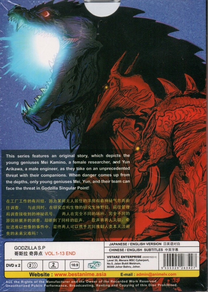 Title Name Godzilla S.P Singular Point Complete TV Series Vol.1-13 End No of Disc 2 Disc Version Japanese Subtitles English / Chinese Format DVD / ALL Region Payment & Shipping: Item will be processed and ship within 2-3 working day (not included weekend or public holiday). Item will be shipped out from the country of original - Malaysia via Registered Mail. It will be routed via your national post service provider. Tracking number will be provided. Item should reach to your doorstep within 2-3 Weeks, subject to custom clearance. Kindly contact us should you fail in receiving the item within 21 working days so that we could trace and track the item . Return Policy: Items can be returned to exchange within 30 days. The buyer is responsible for return shipping cost. Before we ship the item, we will do a final check to make sure the item is in undamaged condition. If the item is missing in the transit, we will refund 100% to the buyer. If buyer have received the incorrect item, please contact us as soon as possible. Please provide picture's which incorrect item status can be clearly shown. We will resolve the problem quickly and after confirm, we will replace the correct item to buyer as soon as possible. Buyer return incorrect item to me must use "Registered Mail" with tracking number so both parties can trace the parcel status.