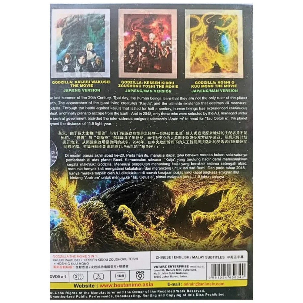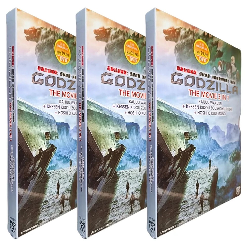 Godzilla The Movie 3 in 1: Kaijuu Wakusei / Kessen Kidou Zoushoku Toshi / Hoshi wo Kuu Mono - *English Dubbed* Product Description: Number of Disc. : 1 DVD Episodes : 3 Movies Audio (Dialogue): English / Japanese Subtitled : English / Chinese / Malay DVD Region Code : Region Free, All (NTSC) Experience the epic battles and awe-inspiring adventures of "Godzilla: The Movie 3 in 1" with this comprehensive DVD set. Encompassing the films "Kaijuu Wakusei" (Godzilla's Rebirth), "Kessen Kidou" (Mission: Rescue), and "Hoshi O Kuu Mono" (The Star Swallower), you're in for hours of action-packed entertainment. Each DVD boasts a video format of NTSC and is presented in a sleek tall/DVD case, ensuring your collection looks as good as it feels. The DVD set features a diverse range of subtitles in English, Chinese, and Malay, catering to a broad audience. With a studio behind it that includes the renowned Polygon Pictures, the movies are a testament to high-quality animation and storytelling. Rated R for its intense scenes, this box set is a must-have for fans of action, adventure, and sci-fi fantasy, complete with an aspect ratio of 16:9 for a visually stunning experience.