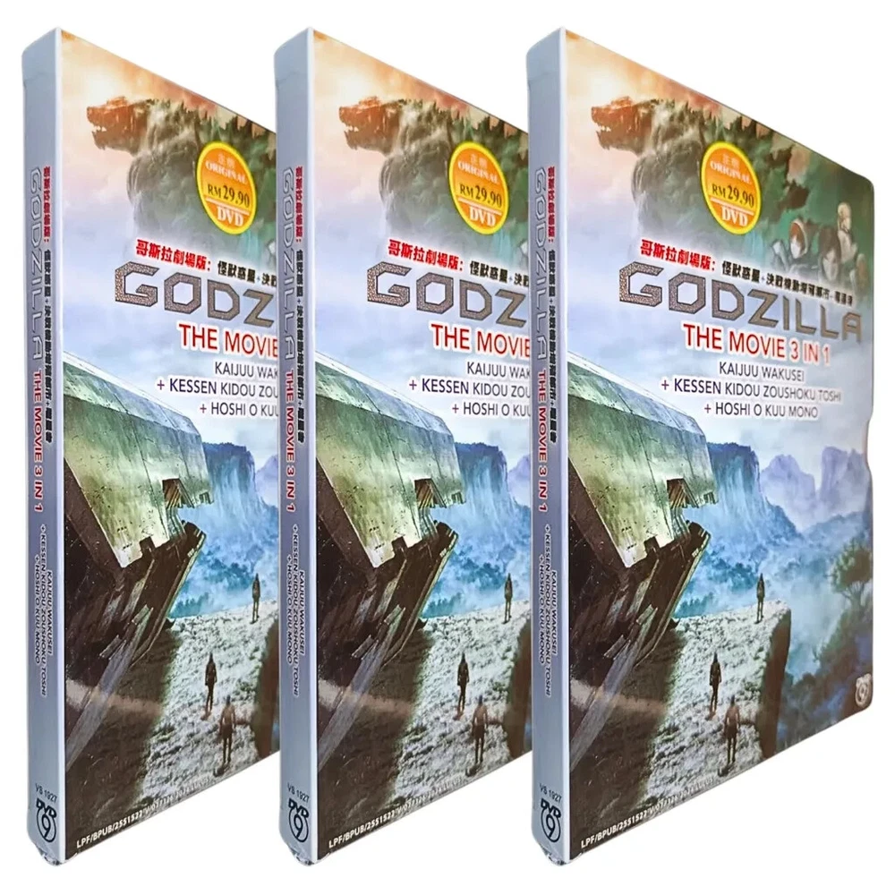 The DVD set titled "Godzilla The Movie 3in1 Kaijuu Wakusei+Kessen Kidou+Hoshi O Kuu Mono Eng Dub" features a collection of Japanese animated Godzilla movies directed by Hiroyuki Seshita and produced by TOHO animation. The DVDs are in NTSC format with English, Chinese, and Malay subtitles, and a PG-13 rating. The set includes the films "Kaijuu Wakusei," "Kessen Kidou," and "Hoshi O Kuu Mono," showcasing action, adventure, and sci-fi genres in a 16:9 aspect ratio and a dubbed English and Japanese language track. Godzilla The Movie 3 in 1: Kaijuu Wakusei / Kessen Kidou Zoushoku Toshi / Hoshi wo Kuu Mono - *English Dubbed* Weight : 163g Number of Disc. : 1 DVD Episodes : 3 Movies Audio (Dialogue) : English / Japanese Subtitled : English / Chinese / Malay DVD Region Code : Region Free, All (NTSC)