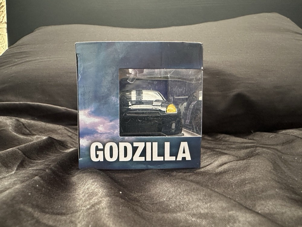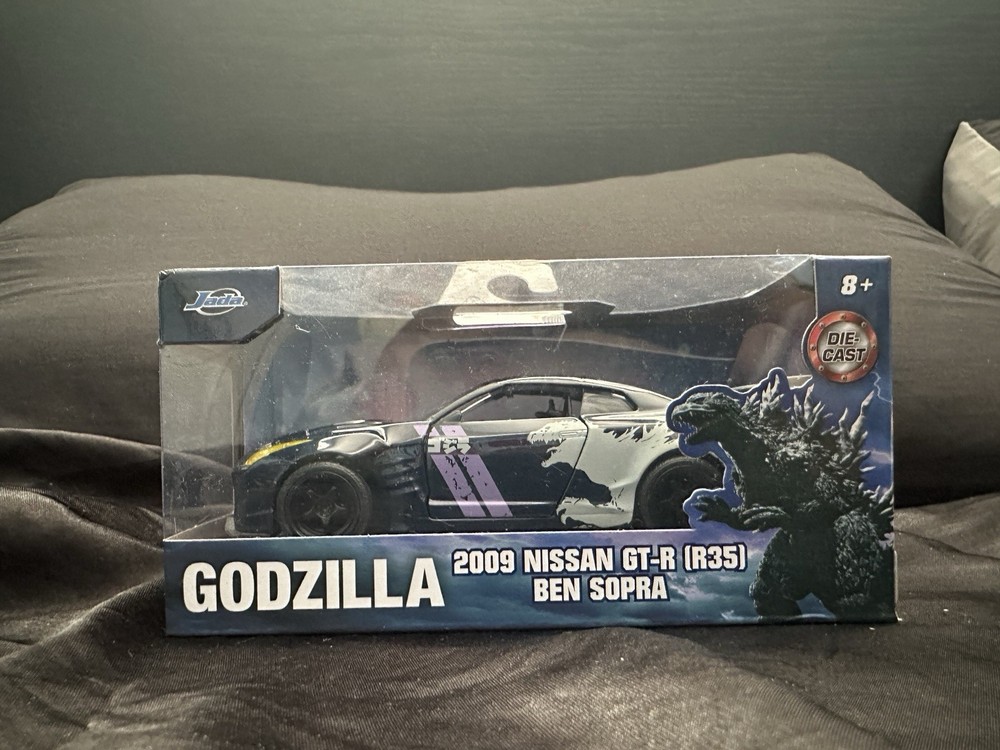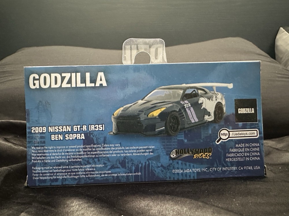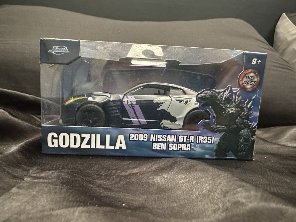 The product is a Jada Toys die-cast model of the 2009 Nissan GT-R in a multi-color design, featuring a Godzilla theme. The 1:32 scale model is made of die-cast material and comes in an unopened box. This collectible item combines the popular Godzilla character family with a high-quality replica of the iconic Nissan GT-R, making it a must-have for fans of both die-cast racing cars and Godzilla.