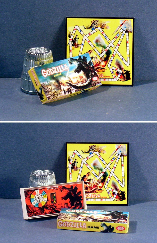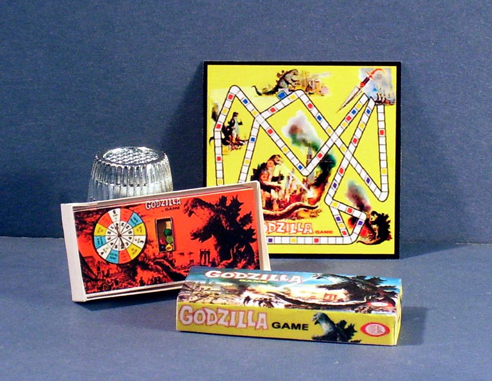 Dollhouse Miniature 1:12 scale Godzilla Game dolhouse 1960s movie monster game 1/12" SCALE DOLL HOUSE MINIATURES Dollhouse Miniature GODZILLA GAME Detailed miniature replica of a Godzilla game from 1963! It comes with the game box that opens to a picture inside ...and includes the little game board! A fun accessory for a 1960's dollhouse, miniature diorama or memory box! Box is 1 3/4" x 3/4" x 3/16" deep Game board is 1 3/8" square Fun for Dollhouse Halloween displays or your Haunted House! SHIPPING WILL BE COMBINED! One shipping charge includes as many items as you purchase. It should be automatically combined in your shopping cart or I will refund any overpaid shipping charges. ---------------------------------------------------------------------------------------------------------- All items are made with the best quality papers and card. SEE MY STORE FOR A LARGE SELECTION OF FUN & DELIGHTFUL ACCESSORIES FOR YOUR DOLL HOUSE, MINIATURE ROOMS OR SHOPS! Replicas of antique and vintage Doll Boxes...Paper Dolls... Little Golden Book sets...Haunted House and Christmas items... and other Games including The Mummy, Boris Karloff, Creature From the Black Lagoon and many more!
