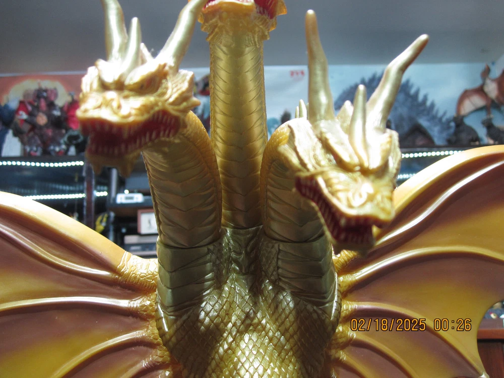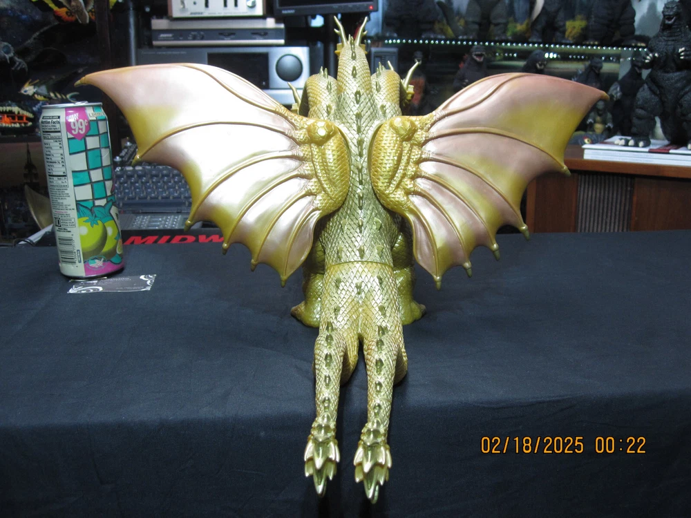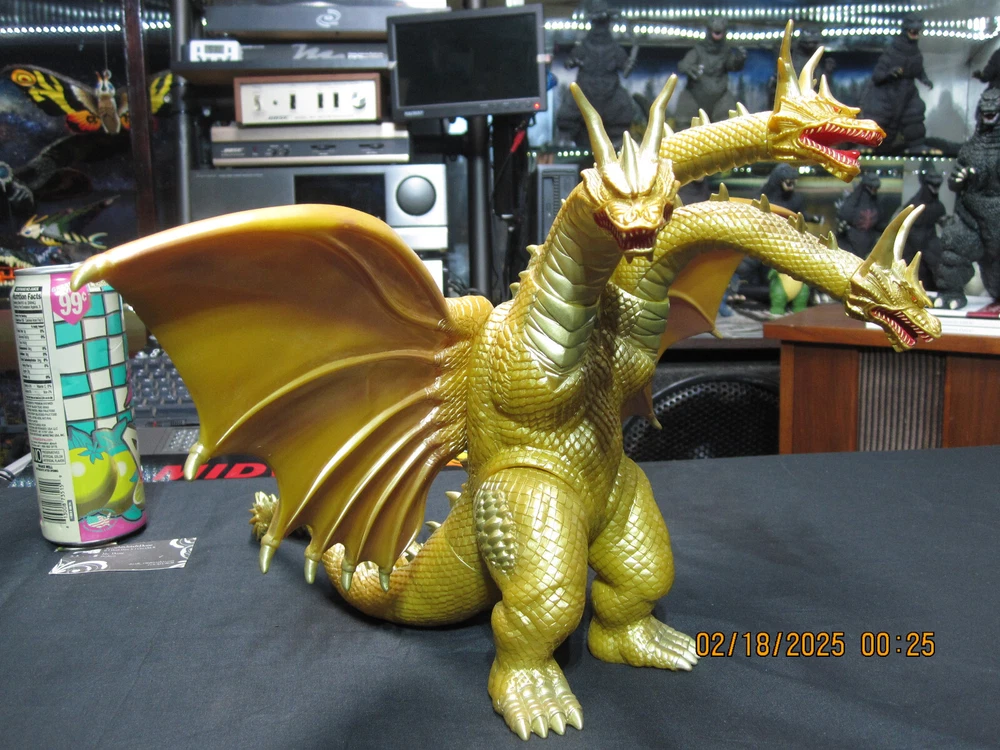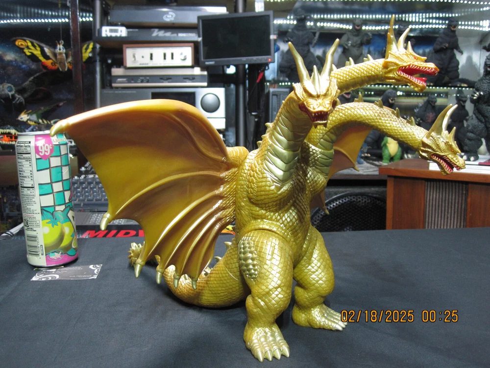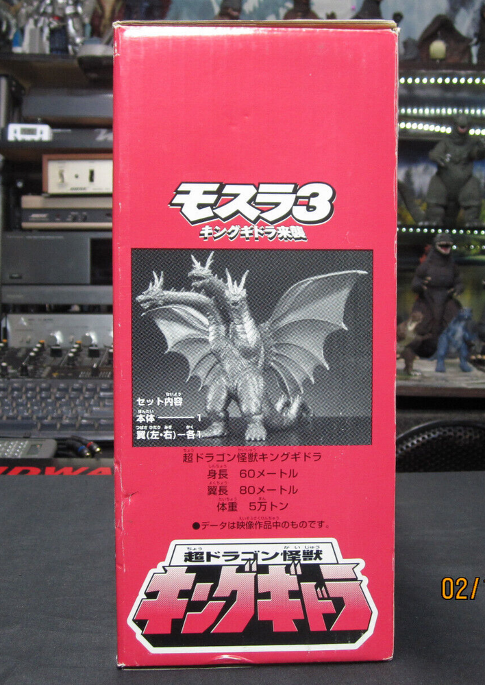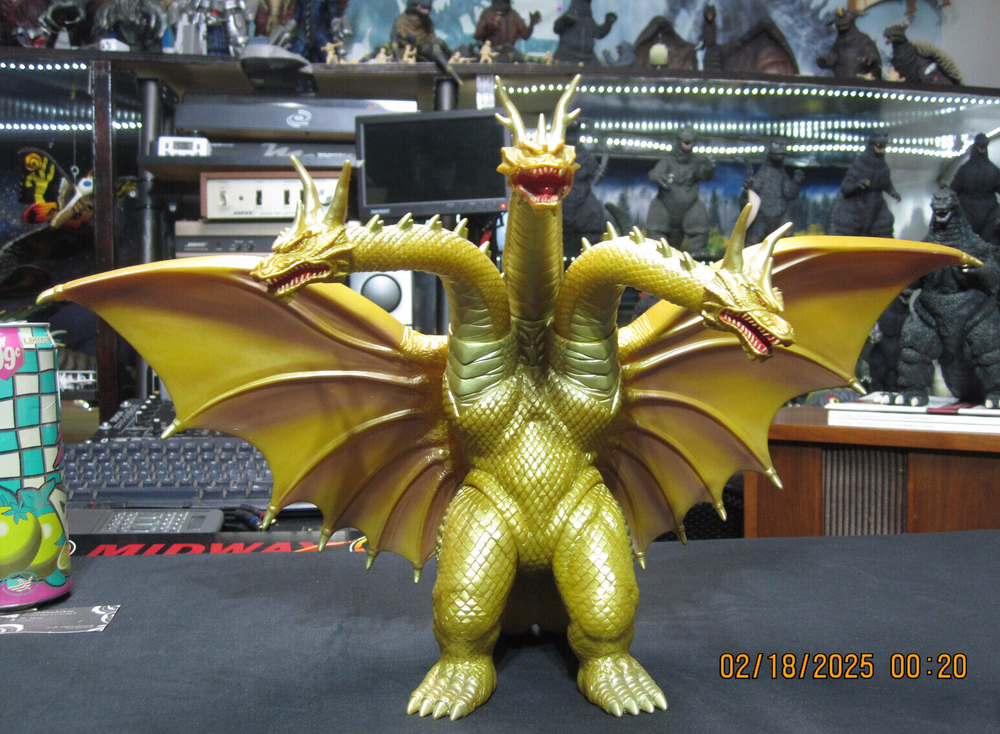 This is a rare find for collectors and fans of the Godzilla franchise. This 1998 Bandai Grand King Ghidorah 12" vinyl figure is a must-have for any serious collector. The figure comes with its original box, making it a great addition to any display. The King Ghidorah action figure is part of the Toho Monster Series and features intricate details that make it stand out on any shelf. This Cretaceous King Ghidorah figure is made in China and is recommended for ages 17 and up. Don't miss out on the chance to own this piece of monster history. ““This Item was displayed in my collection for years. Like New Condition.””