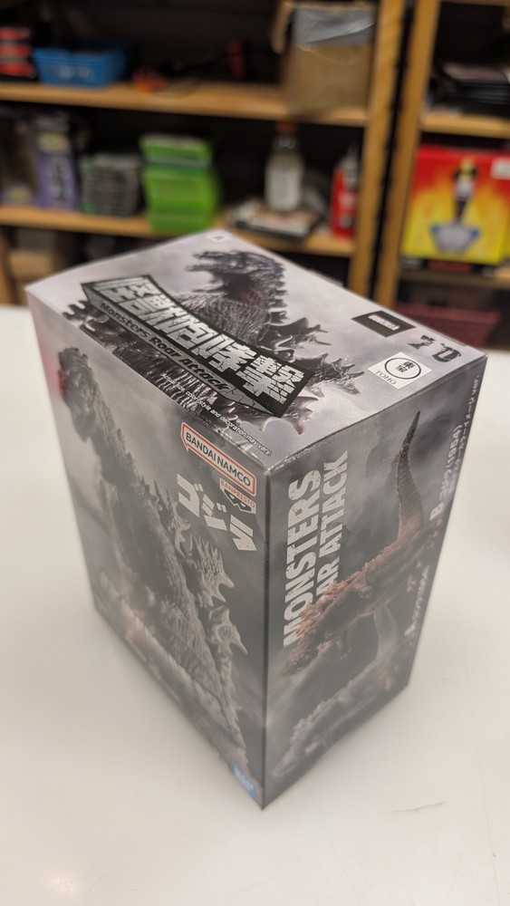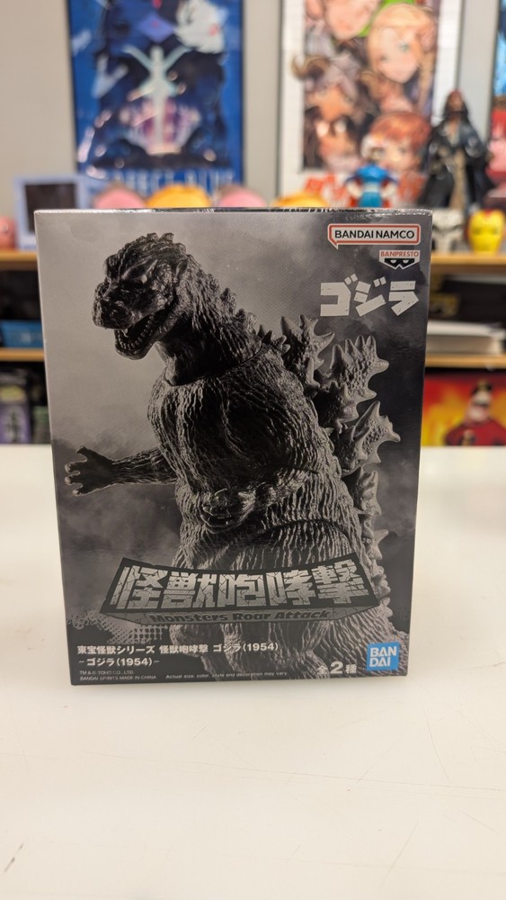 This is a Bandai Godzilla 1954 figure in black and white, standing at 5.5 inches tall. It is from the Godzilla franchise and features a Monsters Roar Attack theme. The figure is made of PVC material and is manufactured in Japan by Toho in 2024. This collectible item is part of the Animation and Anime & Manga themes.