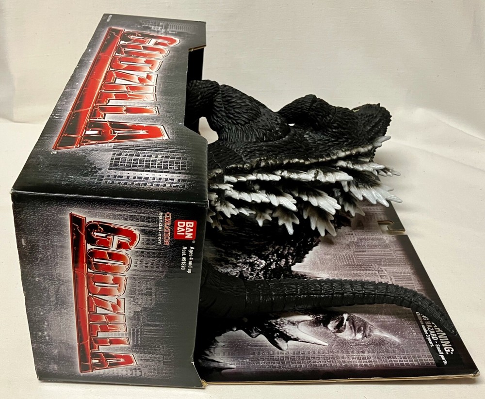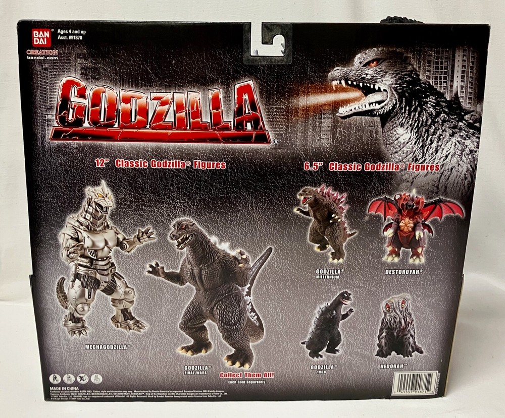 This is GODZILLA, a 2007 Bandai Action Figure that is brand new in it's Display Box. Absolutely mint! The head, legs and tail swivels. 10" high, 12-1/8" across (from tip of nose to end of tail). #91870. UPC: 045557918712. Manufactured by Bandai America Inc, CA. © 200 Toho Ltd. Condition: Mint. Shipping by USPS Ground Advantage, F edEx Ground or FedEx Home Delivery, or UPS Ground.