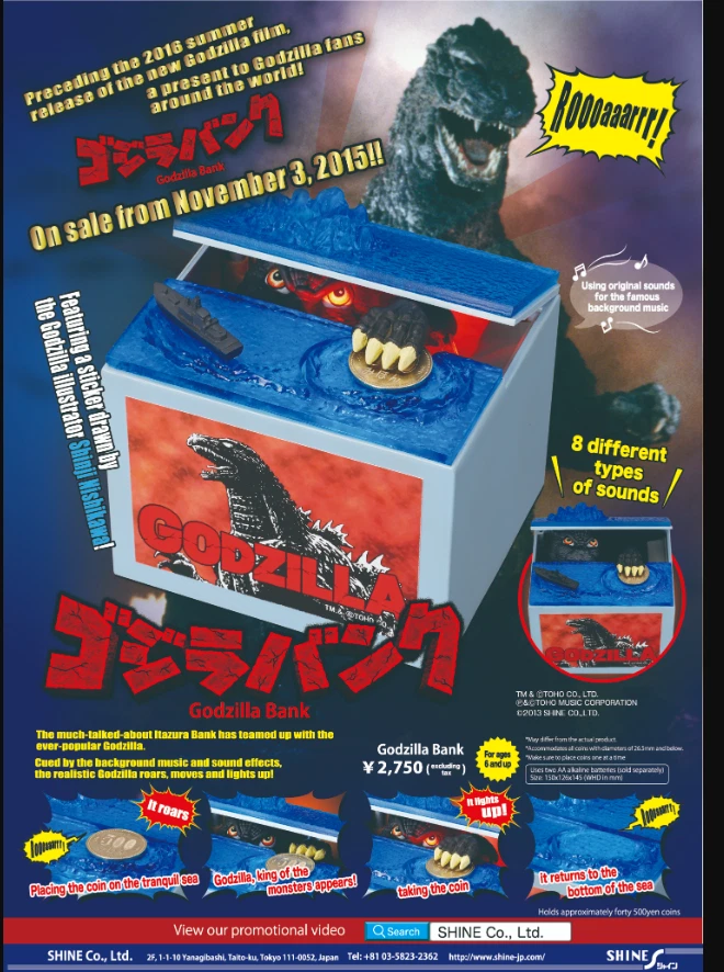 GODZILLA 2024 Bank Savings Box Limited Edition series from JAPAN Description About This Items Thank you for taking interest of this item!! Size: 12.6 x 16 x 15.01 cm; 420 g Godzilla glows! The energy-filled monster king emits a suspicious light when he appears. This is a new feature that has not existed in previous mischief BANKs. Godzilla moves! Godzilla appears from underwater in the diorama and attacks the coins! The action is realistic. Godzilla roars! Godzilla roars in a realistic voice, recorded entirely from the original recording! Godzilla's footsteps echo! The famous theme song is played. A total of 8 patterns can be enjoyed at random. Godzilla's original design! The package and sticker designs are newly drawn by manga artist and Godzilla-related designer Shinji Nishikawa. Target age: 6 years old and up Batteries used: 2 AA alkaline batteries (sold separately) Condition This is new item and I'm taking good care of this. This figurine is based on a scene from the movie and is made to resemble the real thing very closely! Shipping We always send the item with a tracking number. So please place an order without any concern on delivery. You can always track the delivery status. I will investigate the delivery status, etc. If you open the claim case, I will not be able to support you. Shipping is only available to the address registered in eBay. If you want us to send another address, please change your address on eBay and then place an order. Shipping is available from Monday to Friday. Weekends are not available because freight (shipping) companies are closed. We do not mark merchandise values below value or mark items in Japan, US and International government regulations prohibit such behavior. About Importer's Obligation Import duties, taxes, and charges are not included in the item price or shipping cost. These charges are the buyer's responsibility. Please check with your country's customs office to determine what these additional costs will be prior to bidding or buying. Thank you for your reading!!