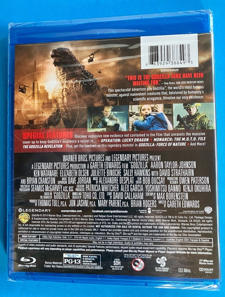 For your consideration, GODZILLA on Blu-ray / DVD, a 2 Disc Set with Slip Sleeve, NEW and still factory sealed. This 2014 movie from Warner Bros. is directed by Gareth Edwards, and features actors like Elizabeth Olsen and Aaron Taylor-Johnson. In addition to the movie, this Blu-ray/DVD set features additional scenes and behind-the-scenes featurettes. This 2-disc set will mail in a bubble mailer to help protect it from damage and it will ship USPS Media Mail so the buyer can track their order. Thanks for looking. If you like sci-fi related movies, feel free to peruse my other eBay listings.