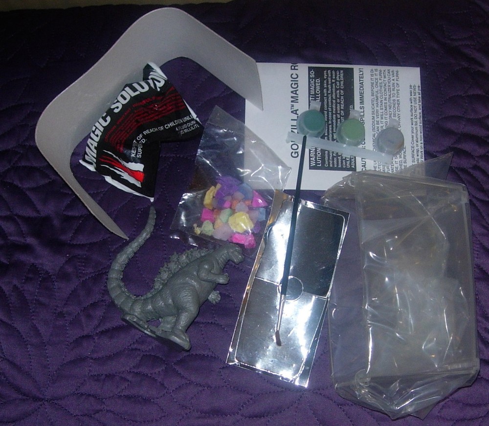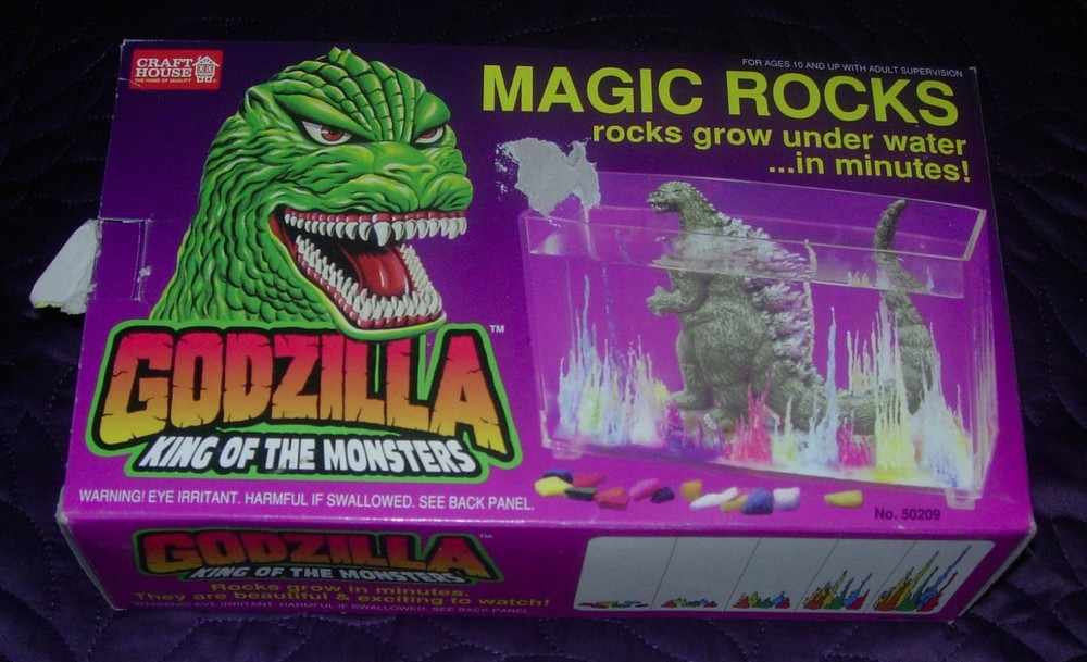 GODZILLA MAGIC ROCKS 1995 UNUSED IN BOX CRAFT HOUSE TOHO Excellent unused condition and contents are complete. The magic solution has hardened inside its pouch. The box shows some tearing and wear but still displays. Price sticker tear to box front. Still a very nice Godzilla item. Unusual. Track Page Views With Auctiva's FREE Counter