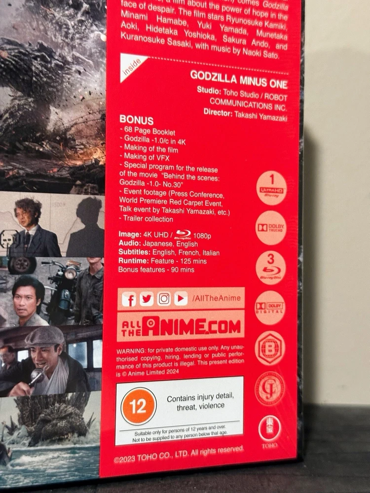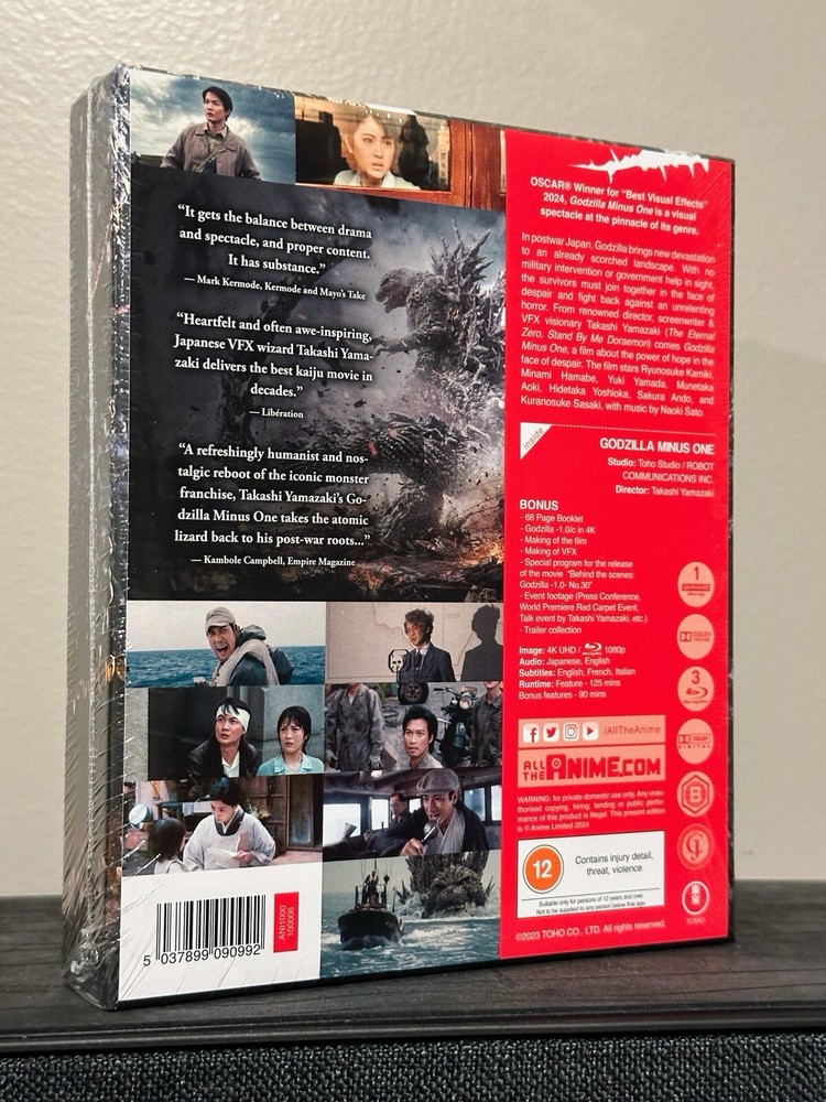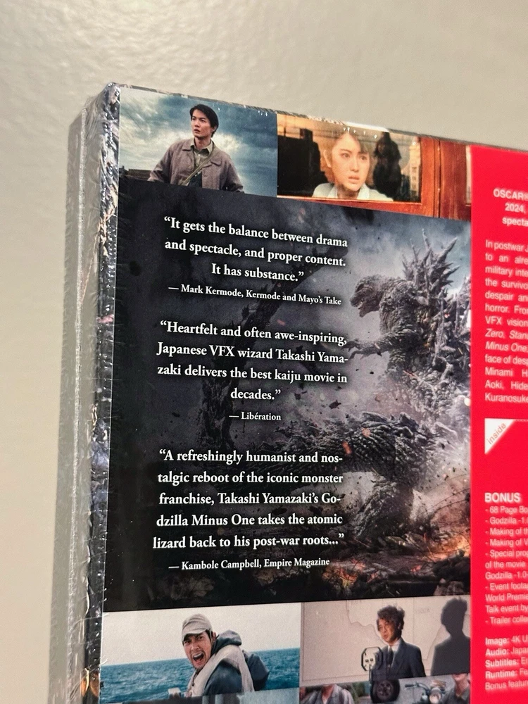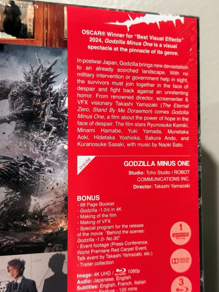Item is new and mint condition! Ships with bubbly wrap, packing paper and box for safe, worldwide shipping. Get it while you can! Enjoy, ConnorCollects PRODUCT INFORMATION In postwar Japan, Godzilla brings new devastation to an already scorched landscape. With no military intervention or government help in sight, the survivors must join together in the face of despair and fight back against an unrelenting horror. From renowned director, screenwriter & VFX visionary Takashi Yamazaki (The Eternal Zero, Stand By Me Doraemon) comes Godzilla Minus One, a film about the power of home in the face of despair. The film stars Ryunosuke Kamiki, Minami Hamabe, Yuki Yamada, Munetaka Aoki, Hidetaka Yoshioka, Sakura Ando, and Kuranosuke Sasaki, with music by Naoki Sato. FEATURES: 64-page booklet Collector's packaging Godzilla Minus One / Minus Color Making of the film Making of VFX Special program for the release of the movie “Behind the scenes: Godzilla -1.0- No.30 Toifumono Event footage (Press Conference, World Premiere Red Carpet Event, Talk event by Takashi Yamazaki, etc.) Trailer collection