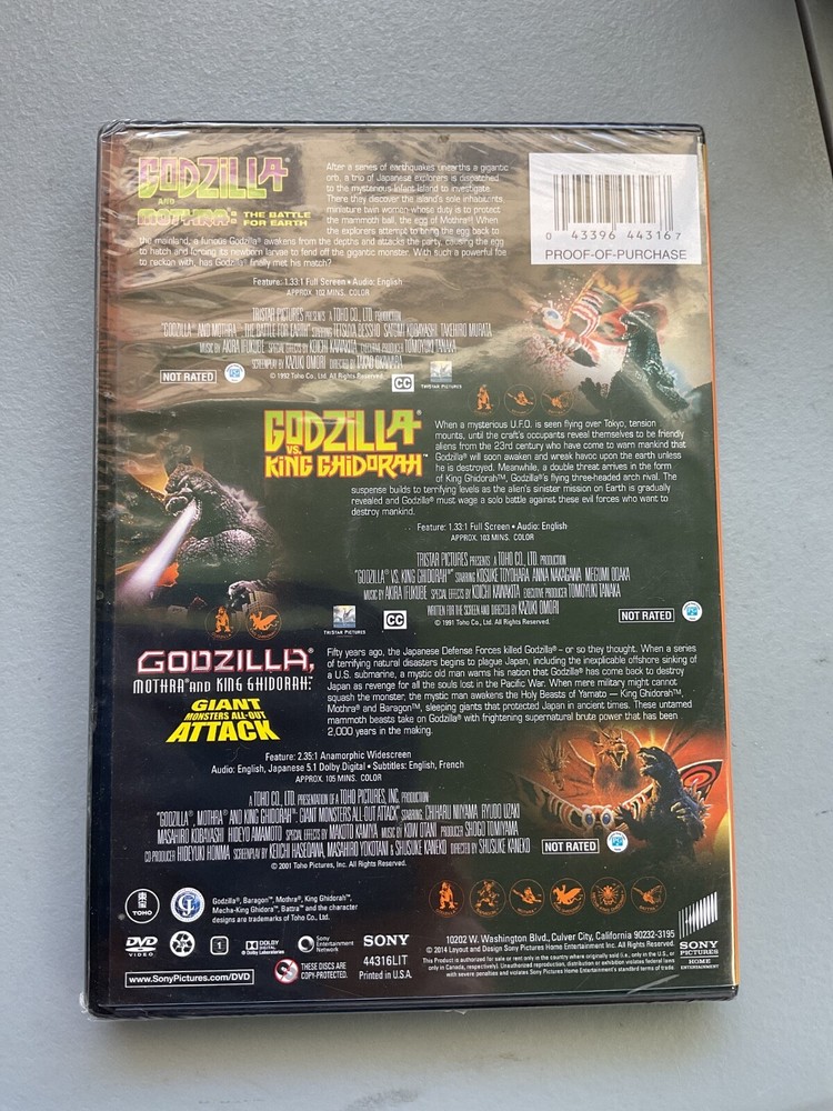 YOU ARE BIDDING ON A BRAND NEW FACTORY SEALED GODZILLA TRIPLE FEATURE *GODZILLA AND MOTHRA *GODZILLA VS KING GHIDORAH *GODZILLA MOTHRA AND KING GHIDORAH DVD MOVIE YOU WILL RECEIVE EXACT DVD PICTURED ALL ITEMS WILL BE SHIPPED WITH CARE THANKS FOR VIEWING MY ITEMS...MATT