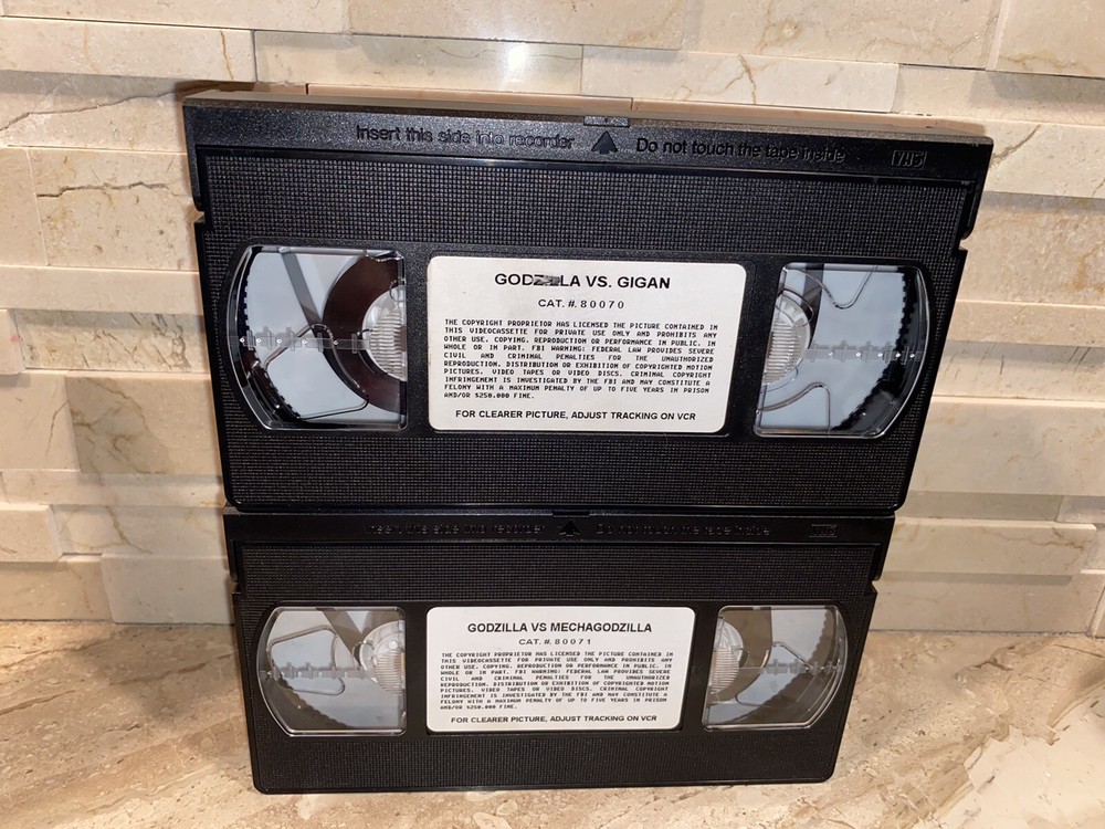 GODZILLA VS. MECHAGODZILLA AND GODZILLA VS. GIGAN DOUBLE FEATURE VHS TAPES. THE TAPES ARE IN GOOD CONDITION, THE BOX IS TORN.