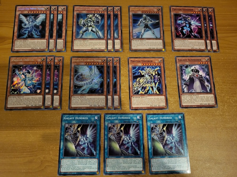 The core contains: 3x Galaxy-Eyes Photon Dragon CT08-EN003 1x Galaxy Knight LDS2-EN049 3x Galaxy Vanisher LDS2-EN050 3x Photon Orbital LDS2-EN051 3x Galaxy-Eyes Afterglow Dragon LDS2-EN052 3x Galaxy Soldier WSUP-EN010 1x Photon Emperor PHHY-EN001 1x Galaxy Summoner PHHY-EN002 3x Galaxy Hundred PHHY-EN051