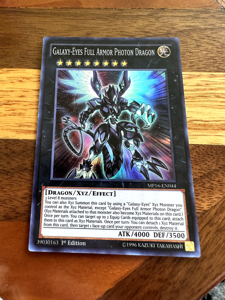Hello! You are buying one Galaxy-Eyes Full Armor Photon Dragon MP16-EN044 1st Edition Super Rare i n near-mint condition. As a thank you for buying from me, I will throw in two free Yugioh commons! Thank you so much for looking, have a great day! If there is ever an issue, please let me know so I can do whatever I can to resolve it! Please check out my other items! I have many more single cards!