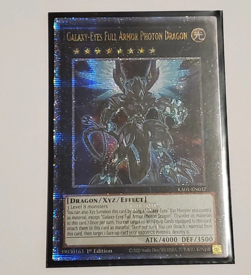 The Galaxy-Eyes Full Armor Photon Dragon is a highly sought-after Quarter Century Secret Rare card from the Yu-Gi-Oh! TCG. With an impressive defense of 3500 and an attack power of 4000, this Light attribute Dragon-type card is part of the 25th Anniversary Rarity Collection. Manufactured by Konami, this 1st Edition Effect Xyz card features stunning graphics and is a must-have for any collector or player looking to enhance their deck with a powerful addition.