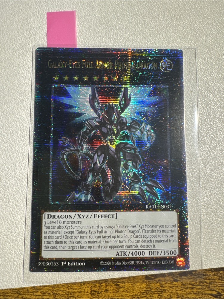 Take your Yu-Gi-Oh! TCG collection to the next level with the Galaxy-Eyes Full Armor Photon Dragon card. This Quarter Century Secret Rare card has an impressive 3500 defense/toughness and 4000 attack/power, making it a formidable addition to your deck. The card features the character Armor and is an Effect Xyz type card with card number RA01-EN037. This 1st edition card is from the 25th Anniversary Rarity Collection and is manufactured by Konami. It is a must-have for any serious collector or player of the game. Don't miss your chance to own this rare and powerful card.