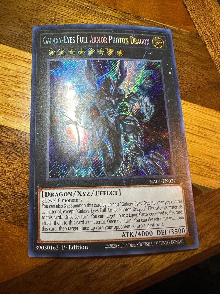 Hello! You are buying one Galaxy-Eyes Full Armor Photon Dragon RA01-EN037 1st Edition Secret Rare i n near-mint condition. As a thank you for buying from me, I will throw in two free Yugioh commons! Thank you so much for looking, have a great day! If there is ever an issue, please let me know so I can do whatever I can to resolve it! Please check out my other items! I have many more single cards!