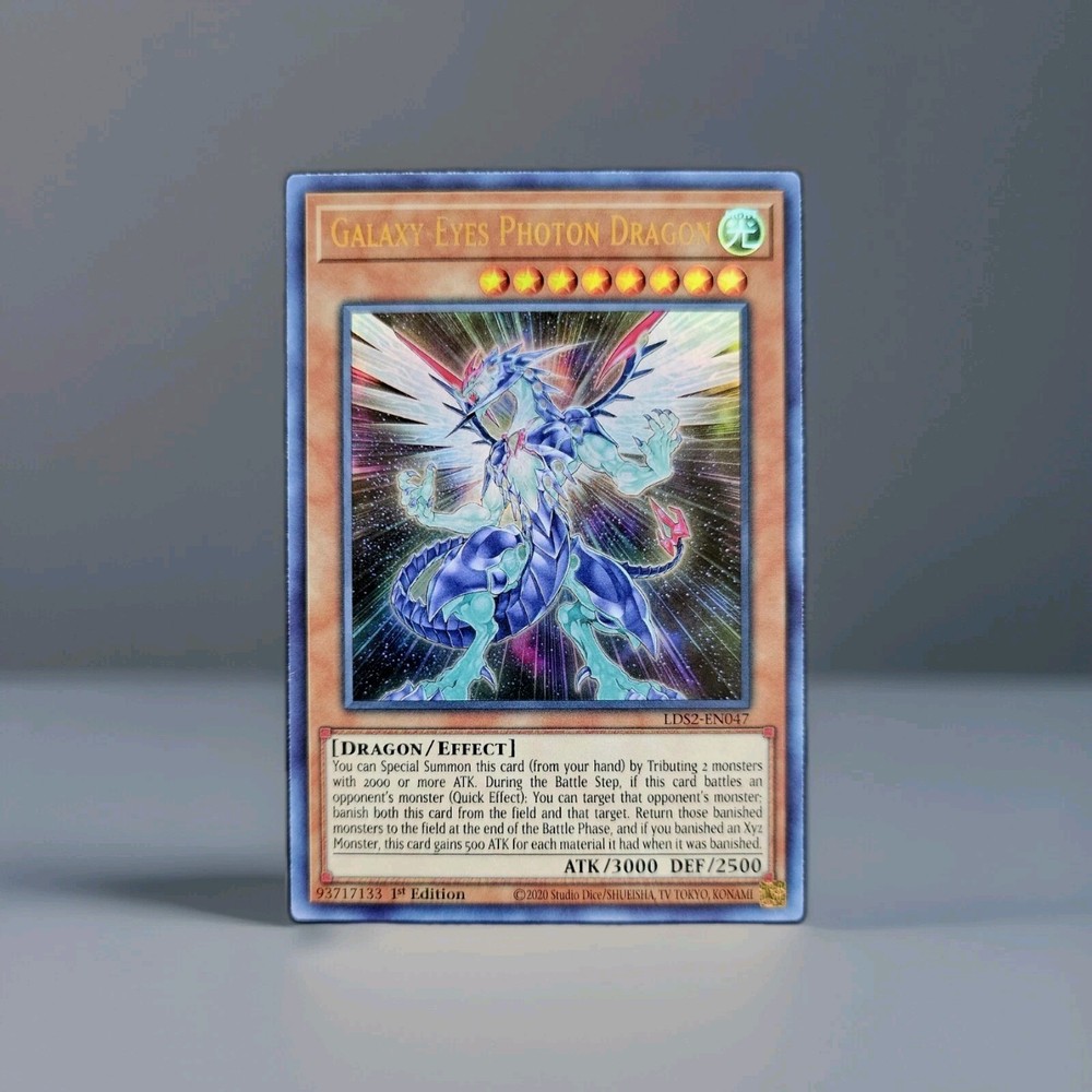 The Galaxy-Eyes Photon Dragon LDS2-EN047 is a highly sought after card in the Yu-Gi-Oh! TCG. This 1st Edition Ultra Rare card features a Japanese card size and belongs to the Light attribute. With a high defense and attack power of 2500 and 3000 respectively, this dragon-themed card is a valuable addition to any collector's deck. Autographed by 5ban Graphics and authenticated by Beckett Authentication Services, this near mint or better card is a must-have for fans of the game.