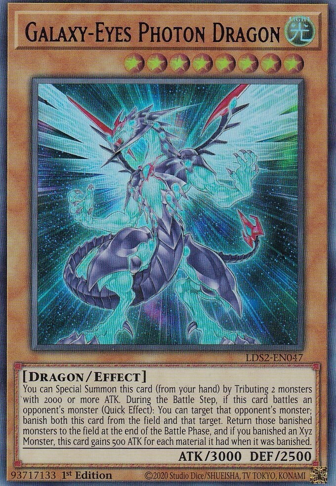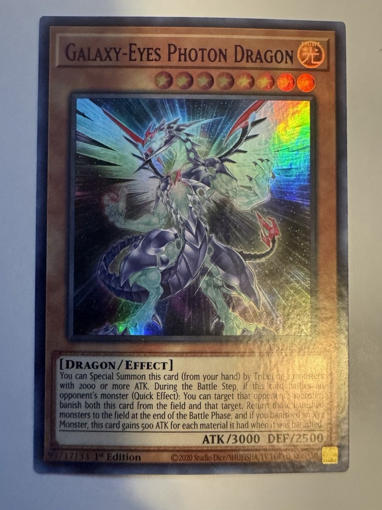 Card has a scratch by the right wing Im gonna be selling my collection that I have been collecting for over the past 5 years. Follow my profile for new things that I post. Gonna be selling my sealed Pokemon, Yu-Gi-Oh, One Piece and Sports Booster boxes, Booster Packs and Single cards as well as video games and collectible toys Ships Ebay standard Elevate your Yu-Gi-Oh! TCG collection with the ethereal Galaxy-Eyes Photon Dragon from Legendary Duelists: Season 2 set. This card, numbered LDS2-EN047, is a standout with its striking foil finish and the enchanting Purple Ultra Rare rarity. Konami's craftsmanship shines through with this Effect-type Basic card, presenting itself in English language for your dueling pleasure.Boasting its 1st Edition status, the Galaxy-Eyes Photon Dragon is a must-have for collectors and players alike. Its unique attribute of 'Purple' adds a splash of strategic depth to your game. With the card's stage classification as 'Basic', it's ready to make a powerful impact in your deck, balancing offense and defense with ease.